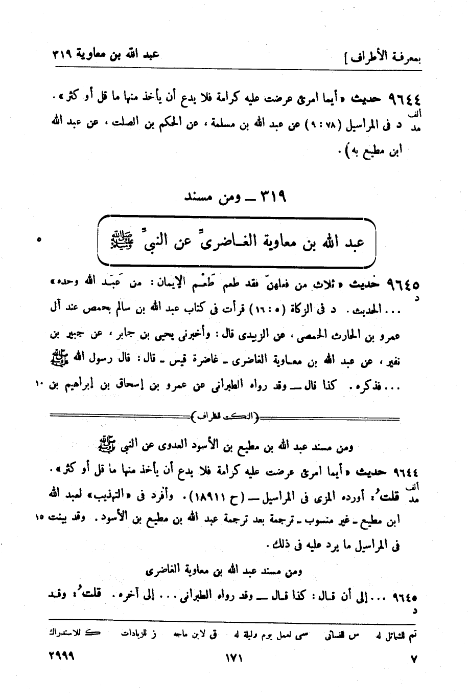 د في الزكاة (5: 16) قرأت في كتاب عبد الله بن سالم بحمص عند أل عمرو بن الحارث الحمصي، عن الزبيدي قال: وأخبرني يحيى بن جابر، عن جبير بن نفير، عن عبد الله بن معاوية الغاضري - غاضرة قيس - قال: قال رسول الله صَلَّى اللَّهُ عَلَيْهِ وَسَلَّمَ ... فذكره. كذا قال - وقد رواه الطبراني عن عمرو بن إسحاق بن إبراهيم بن -[172]- زِبْرِيق الحمصي، عن أبيه، عن عمرو بن الحارث، عن عبد الله بن سالم، عن الزبيدي، عن يحيى بن جابر، عن عبد الرحمن بن جبير بن نفير حدثه أن أباه حدثه أن عبد الله بن معاوية حدثهم ... فذكره.