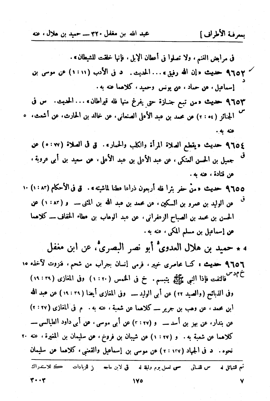 9655 -[ق] حديث من حفر بئراً فله أربعون ذراعاً عطناً لماشيته. (ق) في الأحكام (83: 1) عن الوليد بن عمرو بن السكين، عن محمد بن عبد الله بن المثنى - و (83: 1) عن الحسن بن محمد بن الصباح الزعفراني، عن عبد الوهاب بن عطاء الخفاف - كلاهما عن إسماعيل بن مسلم المكي , عنه به.