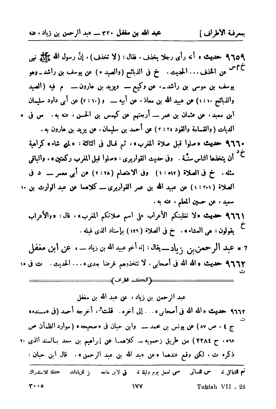 9660 -[خ د] حديث صلوا قبل صلاة المغرب، ثم قال في الثالثة: لمن شاء كراهية أن يتخذها الناس سنَّة. وفي حديث القواريري: صلوا قبل المغرب ركعتين، والباقي مثله. (خ) في الصلاة (512: 1) وفي الاعتصام (28: 2) عن أبي معمر -