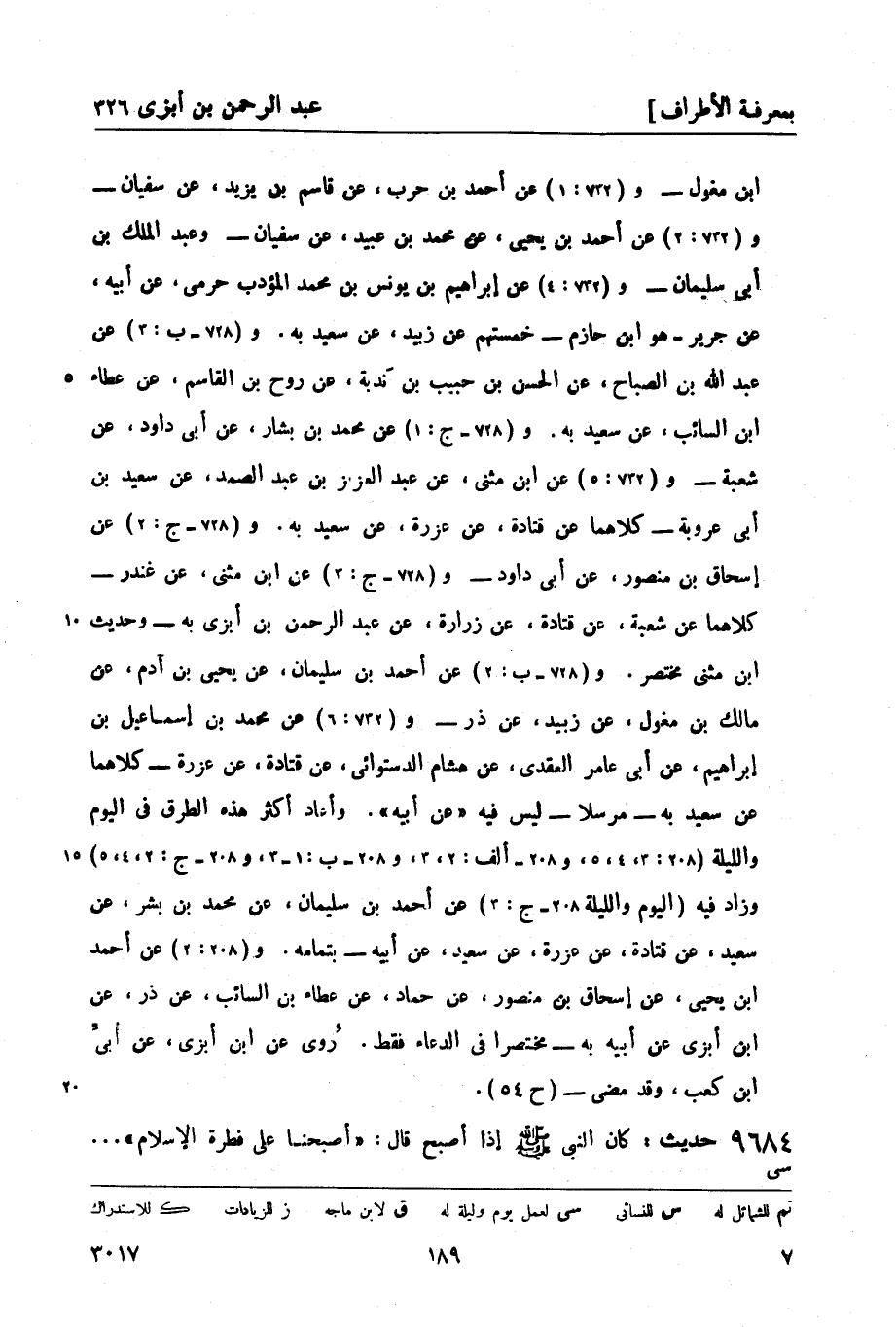 س في اليوم والليلة (1: 1) عن عمرو بن علي، عن يحيى بن سعيد - و (128: 3) عن أحمد بن سليمان، عن أبي داود - و (128: 4) عن أحمد بن حرب، عن قاسم بن يزيد - ثلاثتهم عن سفيان، عن سلمة بن كهيل، عن عبد الله بن عبد الرحمن بن أبزى، عن أبيه به. و (1: 2) عن بندار، عن يحيى، عن سفيان - و (1: 3) عن بندار، عن غندر، عن شعبة - كلاهما عن سلمة بن كهيل، عن ذر، عن ابن عبد الرحمن بن أبزى، عن أبيه به. - ولم يسمِّه. و (؟) عن أحمد بن عثمان بن حكيم، عن بكر بن عبد الرحمن، عن عيسى بن المختار، عن محمد بن عبد الرحمن بن أبي ليلى، عن سلمة، عن سعيد بن عبد الرحمن بن أبزى، عن أبيه به. و (128: 5) عن إسحاق بن إبراهيم، عن شبابة بن سوار، عن شعبة، عن سلمة، عن ذر، عن سعيد، عن أبيه به - وفيه قصة لشعبة، عن محمد بن عبد الرحمن بن أبي ليلى قال: شعبة: أتيت محمداً فقلت: أفدني عن سلمة حديثاً مسنداً عن النبيّ صَلَّى اللَّهُ عَلَيْهِ وَسَلَّمَ فحدث عن ابن أبي أوفى عن النبيّ صَلَّى اللَّهُ عَلَيْهِ وَسَلَّمَ أنه كان يقول إذا أصبح ... الحديث. قال شعبة: فأتيت سلمة فذكرت ذلك له، فقال: لم أسمع من ابن أبي أوفى عن النبيّ صَلَّى اللَّهُ عَلَيْهِ وَسَلَّمَ في هذا شيئاً ... الحديث.