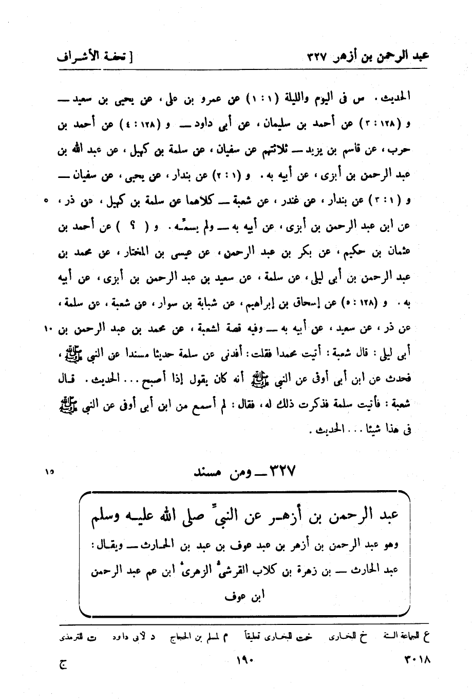 ومن مسند عبد الرحمن بن أزهر عن النبي صَلَّى اللَّهُ عَلَيْهِ وَسَلَّمَ وهو عبد الرحمن بن أزهر بن عبد عوف بن عبد بن الحارث - ويقال: عبد الحارث - بن زهرة بن كلاب القرشيُّ الزهريُّ ابن عم عبد الرحمن بن عوف