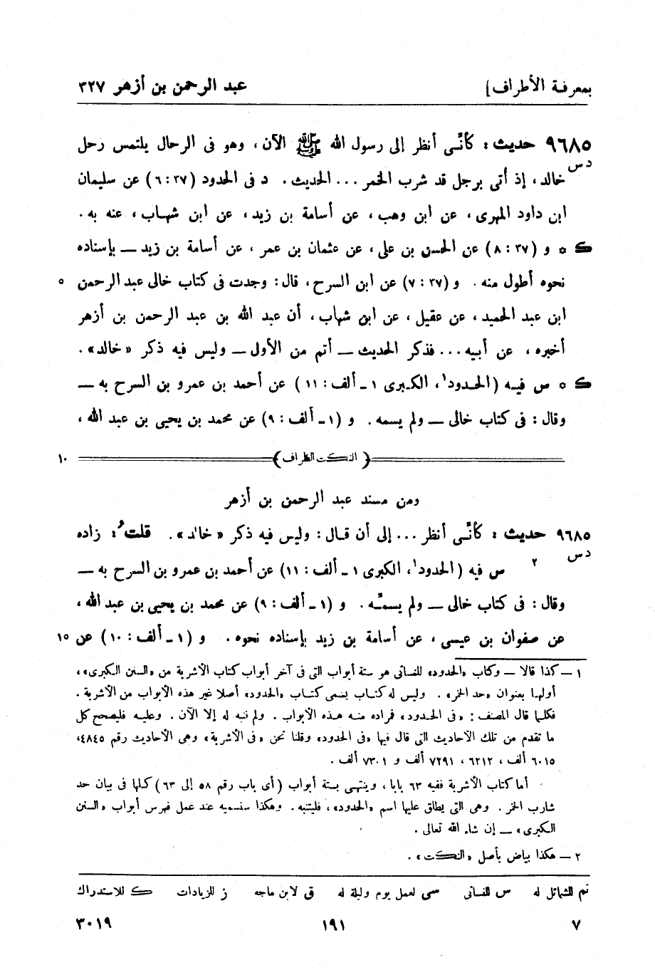 س فيه (الحدود1 , الكبرى 1 - ألف: 11) عن أحمد بن عمرو بن السرح به - وقال: في كتاب خالي - ولم يسمه. و (1 - ألف: 9) عن محمد بن يحيى بن عبد الله، -[192]- عن صفوان بن عيسى، عن أسامة بن زيد بإسناده نحوه. و (1 - ألف: 10) عن أبي داود الحراني، عن يعقوب بن إبراهيم بن سعد، عن أبيه، عن صالح، عن ابن شهاب، أن عبد الرحمن بن أزهر كان يحدث أنه حضر رسول الله صَلَّى اللَّهُ عَلَيْهِ وَسَلَّمَ حين كان يحثي في وجوههم التراب. و (1 - ألف: 12) عن محمد بن إبراهيم بن صدران، عن أزهر بن سعد، عن محمد بن عمرو، عن أبي سلمة، عن عبد الرحمن بن أزهر: أن رسول الله صَلَّى اللَّهُ عَلَيْهِ وَسَلَّمَ أُتي برجل سكران فقال: اضربوه فضربوه بنعالهم. و (1 - ألف: 13) عن محمد بن المثنى، عن محمد بن عبد الله الأنصاري، عن محمد بن عمرو، عن محمد بن إبراهيم التيمي، عن عبد الرحمن بن أزهر نحوه. و (1 - ألف: 14) عن عبد الله بن الصباح بن عبد الله، عن معتمر، عن محمد بن عمرو، عن أبي سلمة ومحمد بن إبراهيم التيمي، كلاهما عن عبد الرحمن بن أزهر قال: أُتي النبيّ صَلَّى اللَّهُ عَلَيْهِ وَسَلَّمَ بشارب يوم حنين ... فذكر نحوه. روي عن محمد بن إبراهيم، عن أبي سلمة، عن أبي هريرة، -[193]- وسيأتي - (ح 14999) . (ك) حديث الحسن بن علي في رواية ابن داسه وغيره ولم يذكره أبو القاسم؛ وكذا حديث