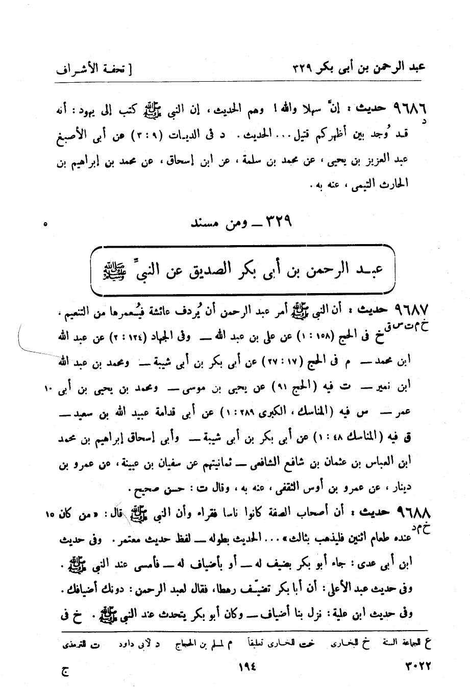 9687 -[خ م ت س ق] حديث: أن النبيّ صَلَّى اللَّهُ عَلَيْهِ وَسَلَّمَ أمر عبد الرحمن أن يُردف عائشة فيُعمرها من التنعيم. (خ) في الحج (158: 1) عن علي بن عبد الله - وفي الجهاد (124: 2) عن عبد الله بن محمد -