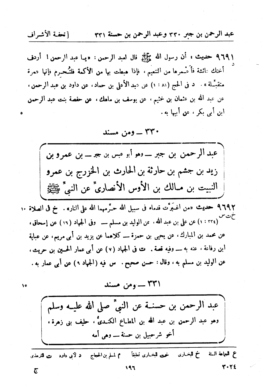 9692 -[خ ت س] حديث من اغبَرَّت قدماه في سبيل الله حرمها الله على النار. (خ) في الصلاة (334: 1) عن علي بن عبد الله، عن الوليد بن مسلم - وفي الجهاد (16) عن إسحاق، عن محمد بن المبارك، عن يحيى بن حمزة - كلاهما عن يزيد بن أبي مريم، عن عباية بن رفاعة، عنه به - وفيه قصة.