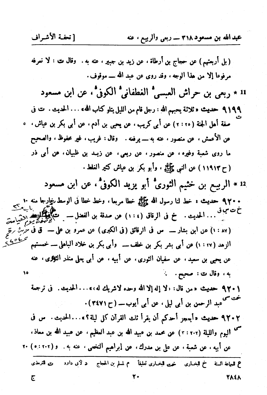 س في اليوم الليلة (202: 3) عن محمد بن عبيد الله بن عبد العظيم، عن عبيد الله بن معاذ، عن أبيه , عن شعبة , عن علي بن مدرك، عن إبراهيم النخعي، عنه به. و [21]- (202: 5) عن أبي كريب , عن أبي معاوية - و (202: 4) عن بندار , عن ابن مهدي , عن سفيان - كلاهما عن الأعمش , عن إبراهيم , عن النبيّ صَلَّى اللَّهُ عَلَيْهِ وَسَلَّمَ - مرسل. و (202: 1) عن قتيبة , عن حماد , عن عاصم , عن زر - و (202: 2) عن أبي كريب , عن أبي بكر بن عياش، عن أبي حصين، عن أبي عبد الرحمن السلمي - كلاهما عن ابن مسعود - قوله.