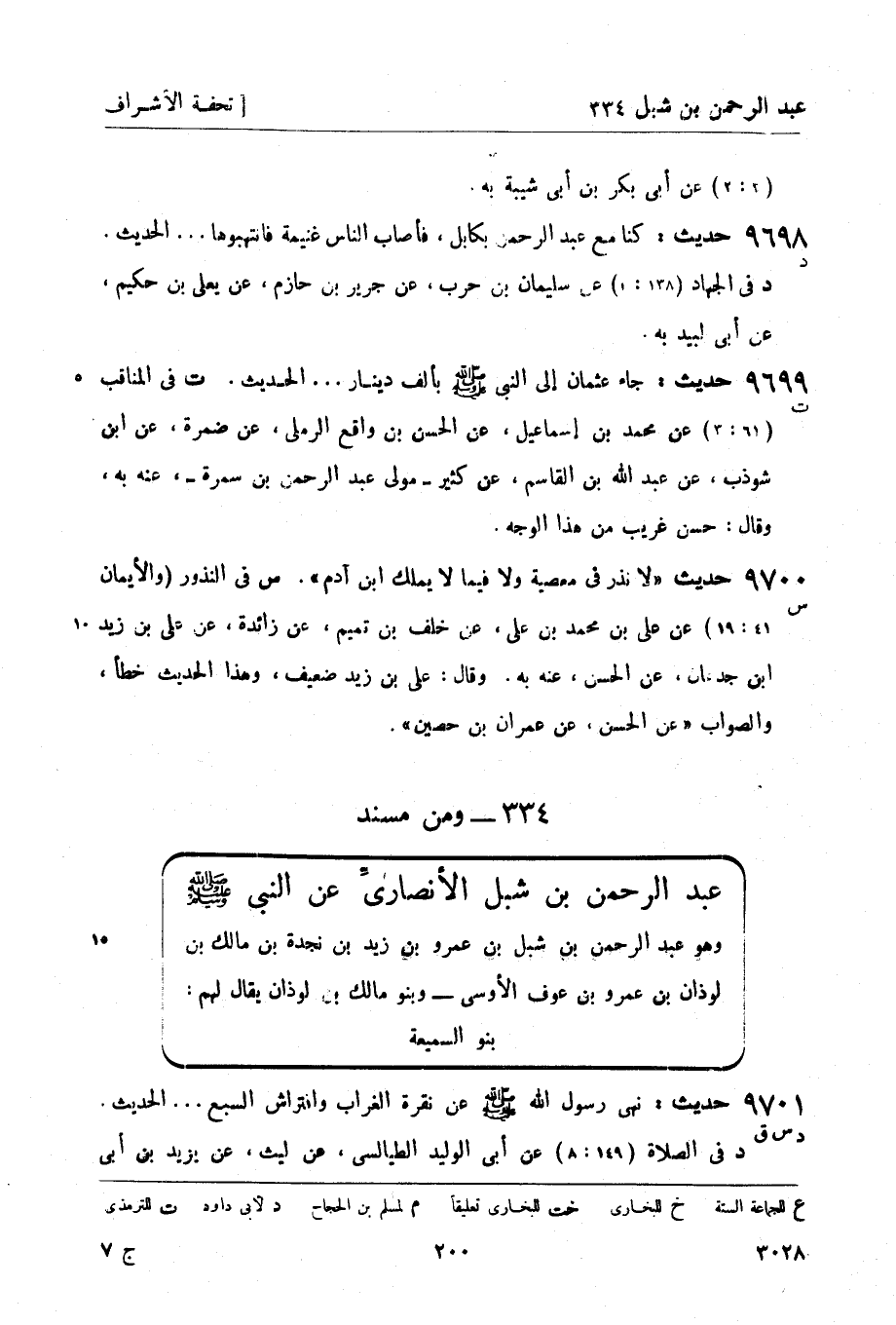 ومن مسند عبد الرحمن بن شبل الأنصاريِّ عن النبي صَلَّى اللَّهُ عَلَيْهِ وَسَلَّمَ وهو عبد الرحمن بن شبل بن عمرو بن زيد بن نجدة بن مالك بن لوذان بن عمرو بن عوف الأوسي - وبنو مالك بن لوذان يقال لهم: بنو السمعية