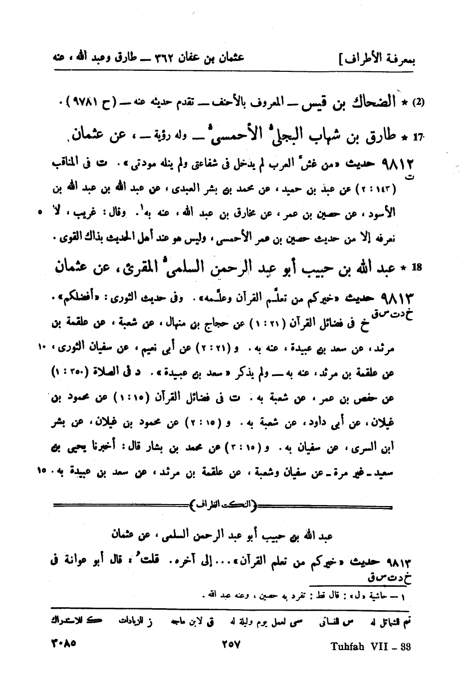 ت في فضائل القرآن (15: 1) عن محمود بن غيلان، عن أبي داود، عن شعبة به. و (15: 2) عن محمود بن غيلان، عن بشر بن السري، عن سفيان به. و (15: 3) عن محمد بن بشار قال: أخبرنا يحيى بن سعيد - غير مرة - عن سفيان وشعبة، عن علقمة بن مرثد، عن سعد بن عبيدة به. -[258]- قال ابن بشار: هكذا ذكر يحيى - غير مرة - عن سفيان , وأصحاب سفيان لا يذكرون فيه، عن سفيان سعد بن عبيدة - وهو أصح - يعني حديث سفيان.