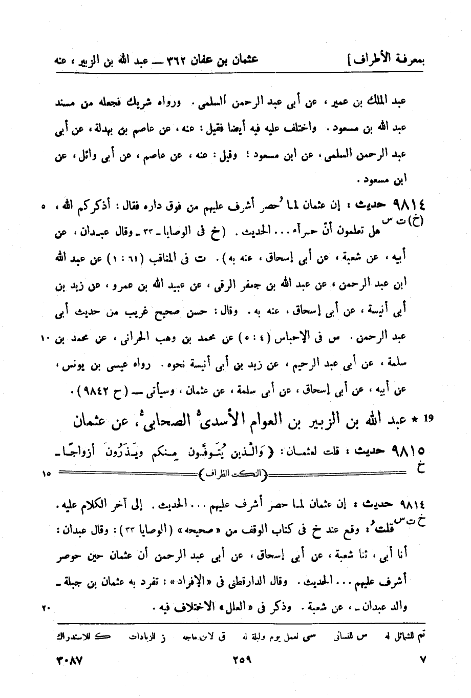 9814 - ((خ) ت س) حديث: إن عثمان لما حُصر أشرف عليهم من فوق داره فقال: أذكركم الله , هل تعلمون أنّ حرآء ... الحديث. (خ في الوصايا - 33 - وقال عبدان، عن أبيه، عن شعبة، عن أبي إسحاق , عنه به) . (ت) في المناقب (61: 1) عن عبد الله بن عبد الرحمن، عن عبد الله بن جعفر الرقي، عن عبيد الله بن عمرو، عن زيد بن أبي أنيسة، عن أبي إسحاق , عنه به. وقال: حسن صحيح غريب من حديث أبي عبد الرحمن. (س) في الإحباس (4: 5) عن محمد بن وهب الحراني، عن محمد بن سلمة، عن أبي عبد الرحيم، عن زيد بن أبي أنيسة نحوه. رواه عيسى بن يونس، عن أبيه، عن أبي إسحاق، عن أبي سلمة، عن عثمان , وسيأتي - (ح 9842) .