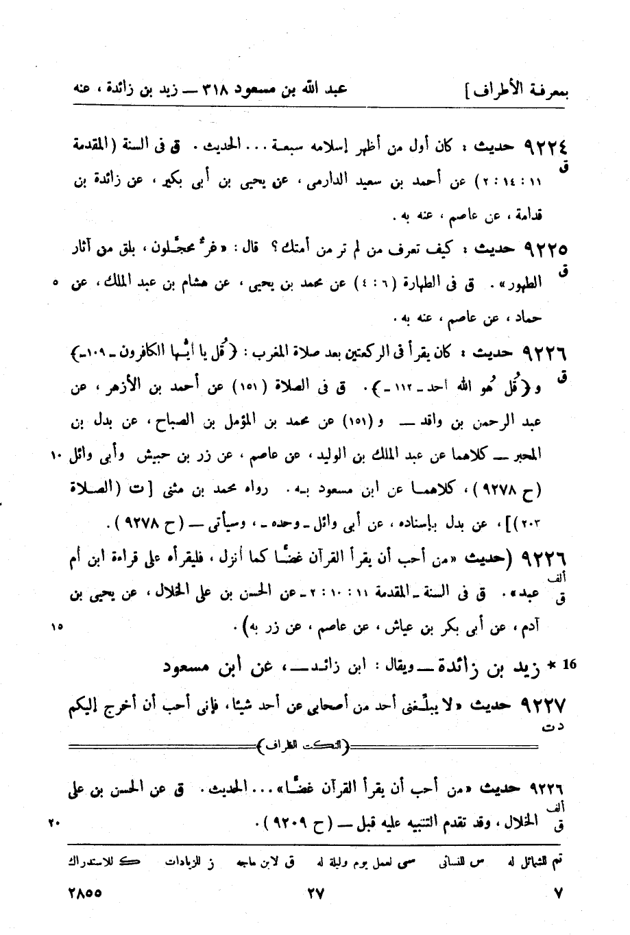 9226 - (ألف) (ق) (حديث من أحب أن يقرأ القرآن غضَّاً كما أُنزل، فليقرأه على قراءة ابن أُم عبد. (ق) في السنة - المقدمة 11: 10: 2 - عن الحسن بن علي الخلال، عن يحيى بن آدم , عن أبي بكر بن عياش، عن عاصم , عن زر به) .