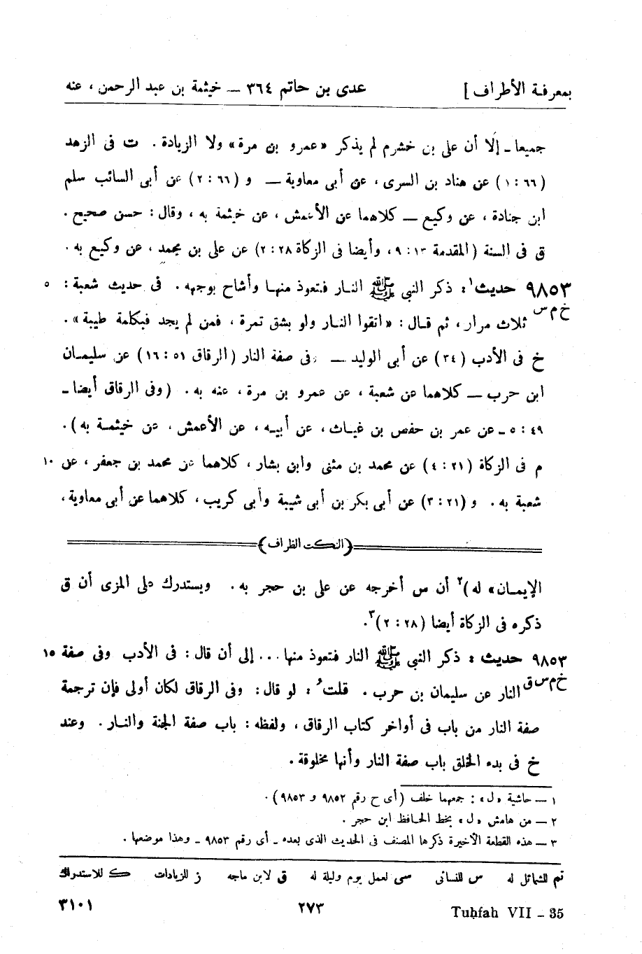 9853 -[خ م س] حديث 1: ذكر النبيّ صَلَّى اللَّهُ عَلَيْهِ وَسَلَّمَ النار فتعوذ منها وأشاح بوجهه. في حديث شعبة: ثلاث مرار , ثم قال: اتقوا النار ولو بشق تمرة , فمن لم يجد فكلمة طيبة. (خ) في الأدب (34) عن أبي الوليد - وفي صفة النار (الرقاق 51: 16) عن سليمان بن حرب - كلاهما عن شعبة، عن عمرو بن مرة , عنه به. (وفي الرقاق أيضاً - 49: 5 -، عن عمر بن حفص بن غياث، عن أبيه، عن الأعمش، عن خيثمة به) .