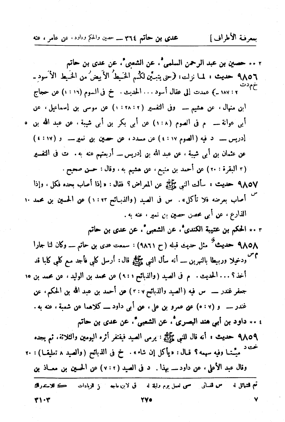 9858 -[م س] حديثٌ مثل حديث قبله (ح 9861) : سمعت عدي بن حاتم - وكان لنا جاراً ودخيلاً وربيطاً بالنهرين - أنه سأل النبيّ صَلَّى اللَّهُ عَلَيْهِ وَسَلَّمَ قال: أُرسل كلبي فأجد مع كلبي كلباً قد أخذ؟ ... الحديث.