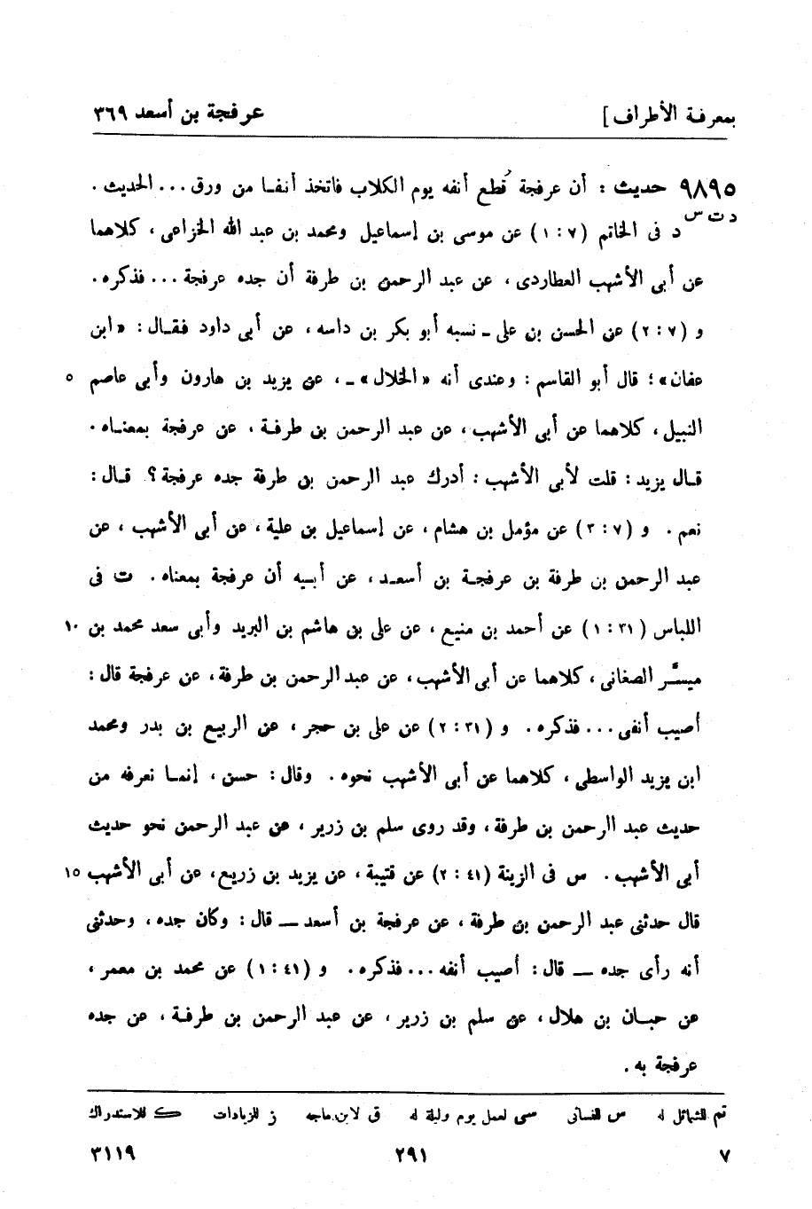 د في الخاتم (7: 1) عن موسى بن إسماعيل ومحمد بن عبد الله الخزاعي , كلاهما عن أبي الأشهب العطاردي، عن عبد الرحمن بن طرفة أن جده عرفجة ... فذكره. و (7: 2) عن الحسن بن علي - نسبه أبو بكر بن داسه، عن أبي داود فقال: ابن عفان؛ قال أبو القاسم: وعندي أنه الخلال -، عن يزيد بن هارون وأبي عاصم النبيل , كلاهما عن أبي الأشهب، عن عبد الرحمن بن طرفة، عن عرفجة بمعناه. قال يزيد: قلت لأبي الأشهب: أدرك عبد الرحمن بن طرفة جده عرفجة؟ قال: نعم. و (7: 3) عن مؤمل بن هشام، عن إسماعيل ابن علية، عن أبي الأشهب، عن عبد الرحمن بن طرفة بن عرفجة بن أسعد، عن أبيه أن عرفجة بمعناه.