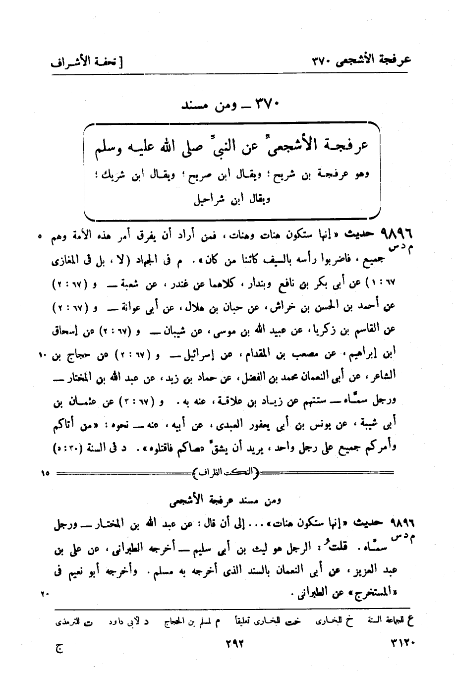 9896 -[م د س] حديث أنها ستكون هنات وهنات , فمن أراد أن يفرق أمر هذه الأمة وهم جميع , فاضربوا رأسه بالسيف كائناً من كان. (م) في الجهاد (لا , بل في المغازي 67: 1) عن أبي بكر بن نافع وبندار , كلاهما عن غندر، عن شعبة - و (67: 2) عن أحمد بن الحسن بن خراش، عن حبان بن هلال، عن أبي عوانة - و (67: 2) عن القاسم بن زكريا، عن عبيد الله بن موسى، عن شيبان - و (67: 2) عن إسحاق بن إبراهيم، عن مصعب بن المقدام، عن إسرائيل - و (67: 2) عن حجاج بن الشاعر، عن أبي النعمان محمد بن الفضل، عن حماد بن زيد، عن عبد الله بن المختار - ورجل سمَّاه - ستتهم عن زياد بن علاقة , عنه به. و (67: 3) عن عثمان بن أبي شيبة، عن يونس بن أبي يعفور العبدي، عن أبيه , عنه - نحوه: من أتاكم وأمركم جميع على رجل واحد , يريد أن يشقَّ عصاكم فاقتلوه.