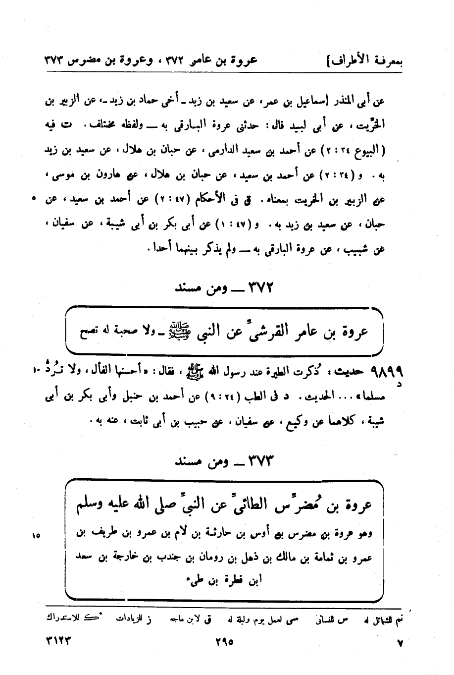 ومن مسند عروة بن مُضرِّس الطائيِّ عن النبي صَلَّى اللَّهُ عَلَيْهِ وَسَلَّمَ وهو عروة بن مضرس بن أوس بن حارثة بن لام بن عمرو بن طريف بن عمرو بن ثمامة بن مالك بن ذهل بن رومان بن جندب بن خارجة بن سعد بن قطرة بن طيء