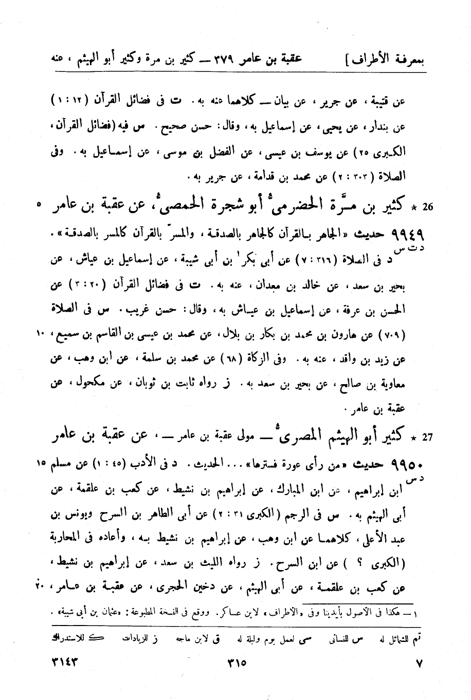 س في الرجم (الكبرى 31: 2) عن أبي الطاهر بن السرح ويونس بن عبد الأعلى , كلاهما عن ابن وهب، عن إبراهيم بن نشيط به , وأعاده في المحاربة (الكبرى؟) عن ابن السرح. (ز) رواه الليث بن سعد، عن إبراهيم بن نشيط، عن كعب بن علقمة، عن أبي الهيثم، عن دخين الحجري، عن عقبة بن عامر , -[316]- وقد مضى - (ح 9924) .