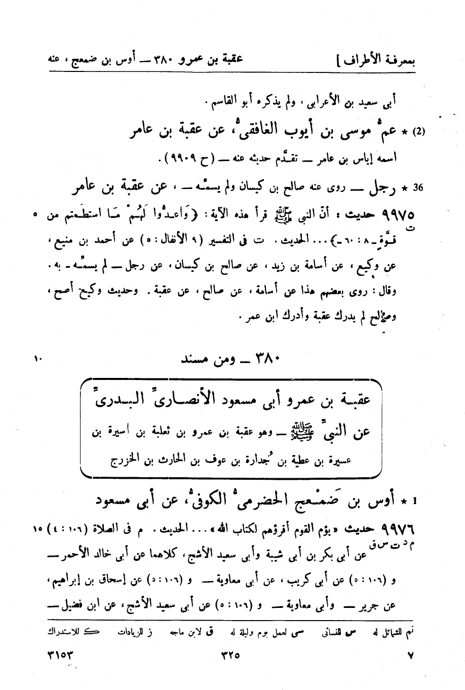 ت في التفسير (9 الأنفال: 5) عن أحمد بن منيع، عن وكيع، عن أسامة بن زيد، عن صالح بن كيسان، عن رجل - لم يسمِّه - به. وقال: روى بعضهم هذا عن أسامة، عن صالح، عن عقبة. وحديث وكيع أصح، وصالح لم يدرك عقبة وأدرك ابن عمر.
