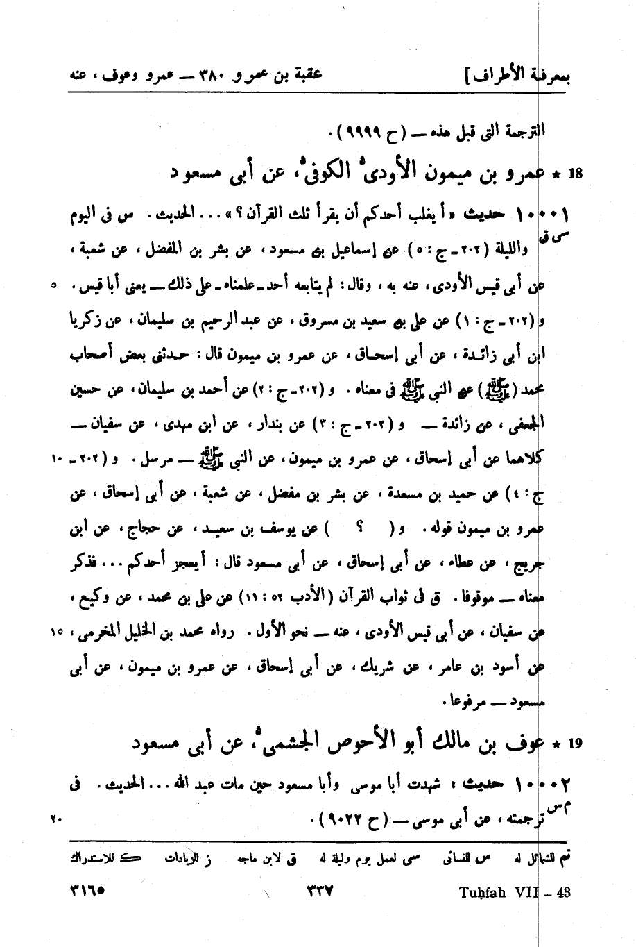 ق في ثواب القرآن (الأدب 52: 11) عن علي بن محمد، عن وكيع، عن سفيان، عن أبي قيس الأودي , عنه - نحو الأول. رواه محمد بن الخليل المخرمي، عن أسود بن عامر، عن شريك، عن أبي إسحاق، عن عمرو بن ميمون، عن أبي مسعود - مرفوعاً.