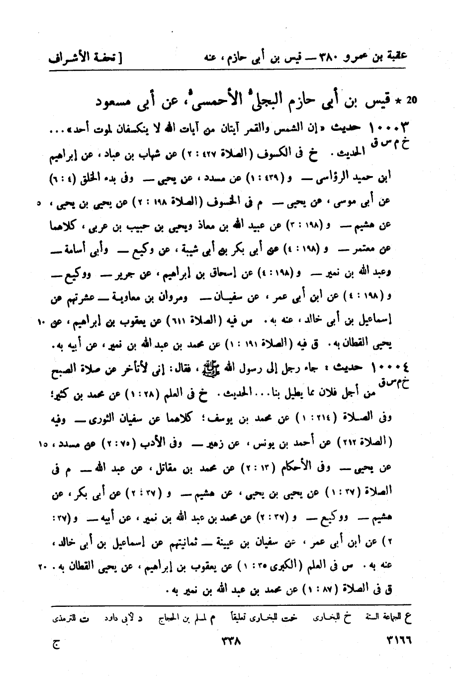 خ في الكسوف (الصلاة 427: 2) عن شهاب بن عباد، عن إبراهيم بن حميد الرؤاسي - و (439: 1) عن مسدد، عن يحيى - وفي بدء الخلق (4: 6) عن أبي موسى، عن يحيى -
