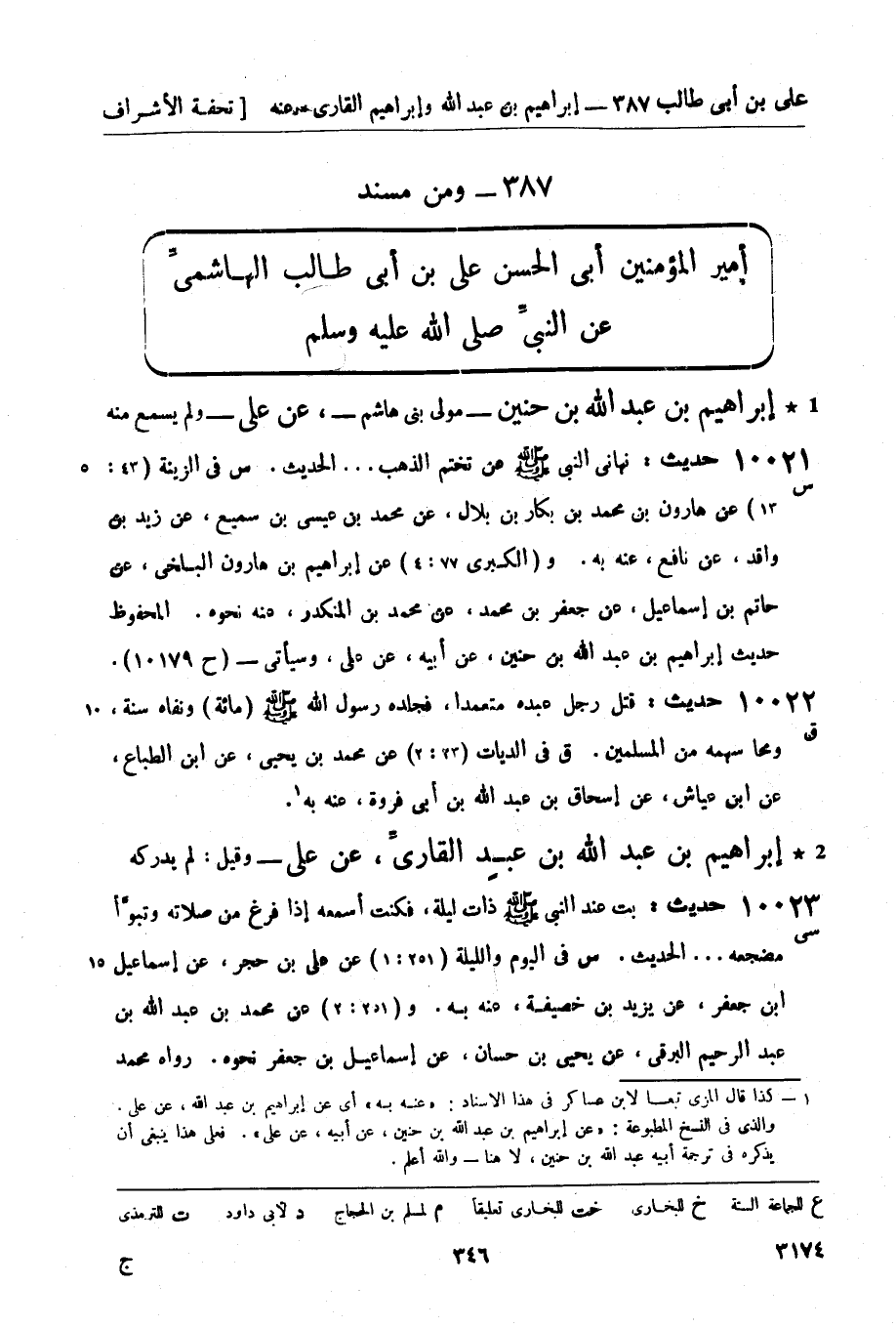 10022 -[ق] حديث: قتل رجل عبده متعمداً , فجلده رسول الله صَلَّى اللَّهُ عَلَيْهِ وَسَلَّمَ (مائة) ونفاه سنة , ومحا سهمه من المسلمين. (ق) في الديات (23: 2) عن محمد بن يحيى، عن ابن الطباع، عن ابن عياش، عن إسحاق بن عبد الله بن أبي فروة , عنه به1.