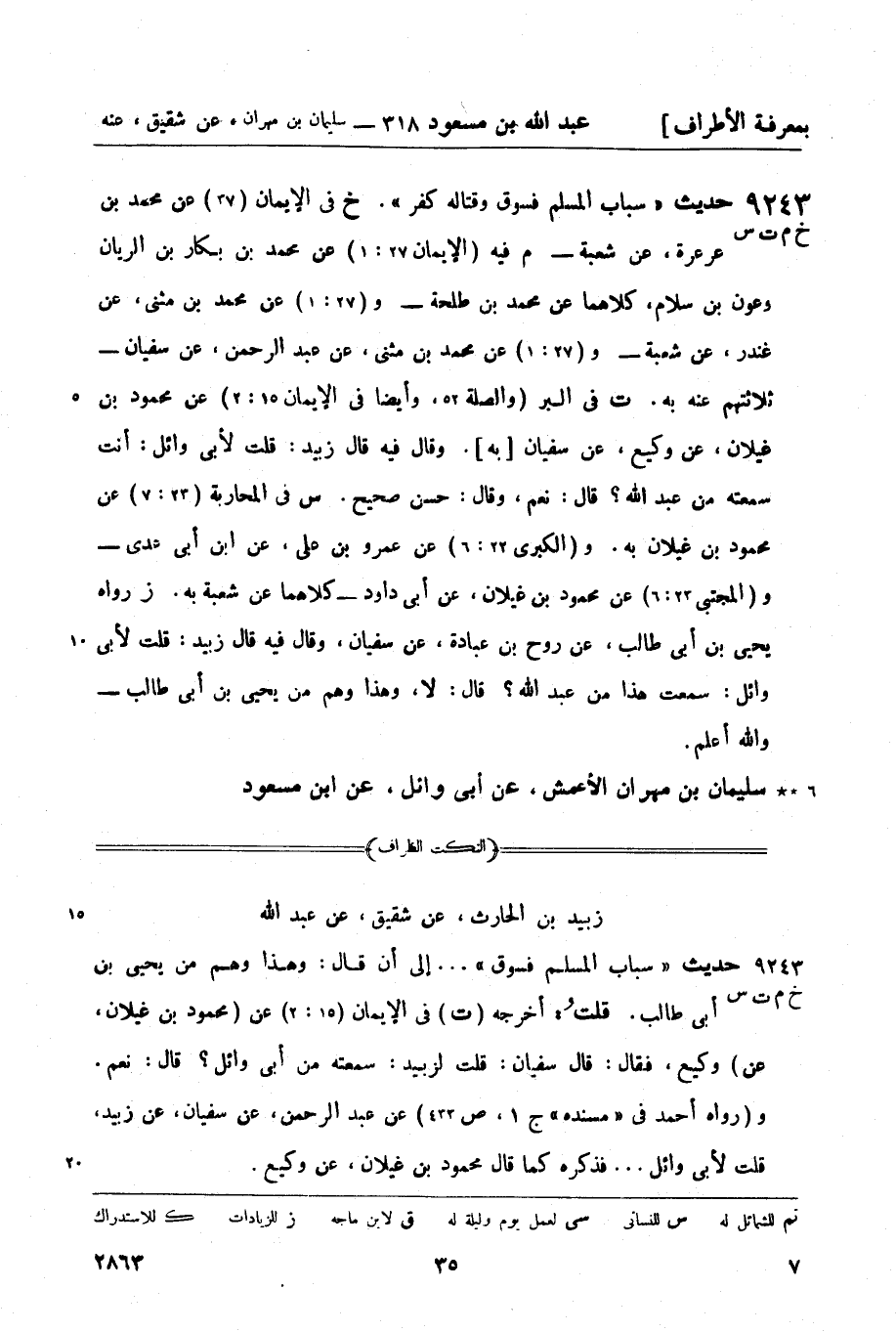 س في المحاربة (23: 7) عن محمود بن غيلان به. و (الكبرى 22: 6) عن عمرو بن علي , عن ابن أبي عدي - و (المجتبى 23: 6) عن محمود بن غيلان , عن أبي داود - كلاهما عن شعبة به. (ز) رواه يحيى بن أبي طالب، عن روح بن عبادة، عن سفيان، وقال فيه زبيد: قلت لأبي وائل: سمعت هذا من عبد الله؟ قال: لا، وهذا وهم من يحيى بن أبي طالب - والله أعلم.
