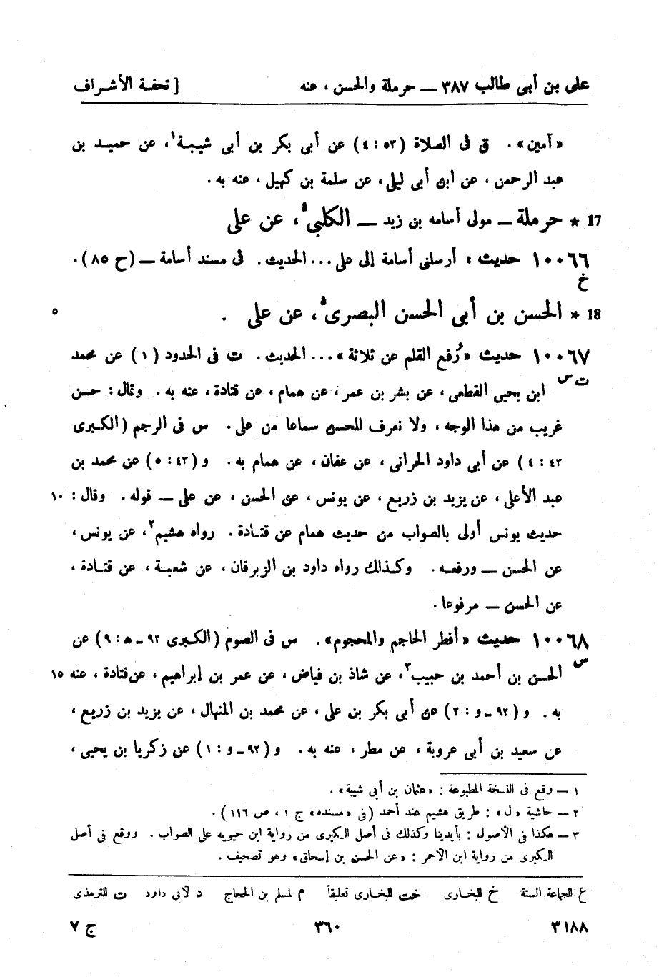 10068 -[س] حديث أفطر الحاجم والمحجوم. (س) في الصوم (الكبرى 92 - هـ: 9) عن الحسن بن أحمد بن حبيب3، عن شاذ بن فياض، عن عمر بن إبراهيم، عن قتادة , عنه به. و (92 - و: 2) عن أبي بكر بن علي، عن محمد بن المنهال، عن يزيد بن زريع، عن سعيد بن أبي عروبة، عن مطر , عنه به. و (92 - و: 1) عن زكريا بن يحيى، -[361]- عن عمرو بن عيسى، عن عبد الأعلى، عن سعيد بن أبي عروبة، عن قتادة بإسناده - موقوفاً. و (92 - هـ: 10) عن أبي بكر بن علي، عن سريج بن يونس، عن محمد بن يزيد، عن أبي العلاء، عن قتادة كذلك.