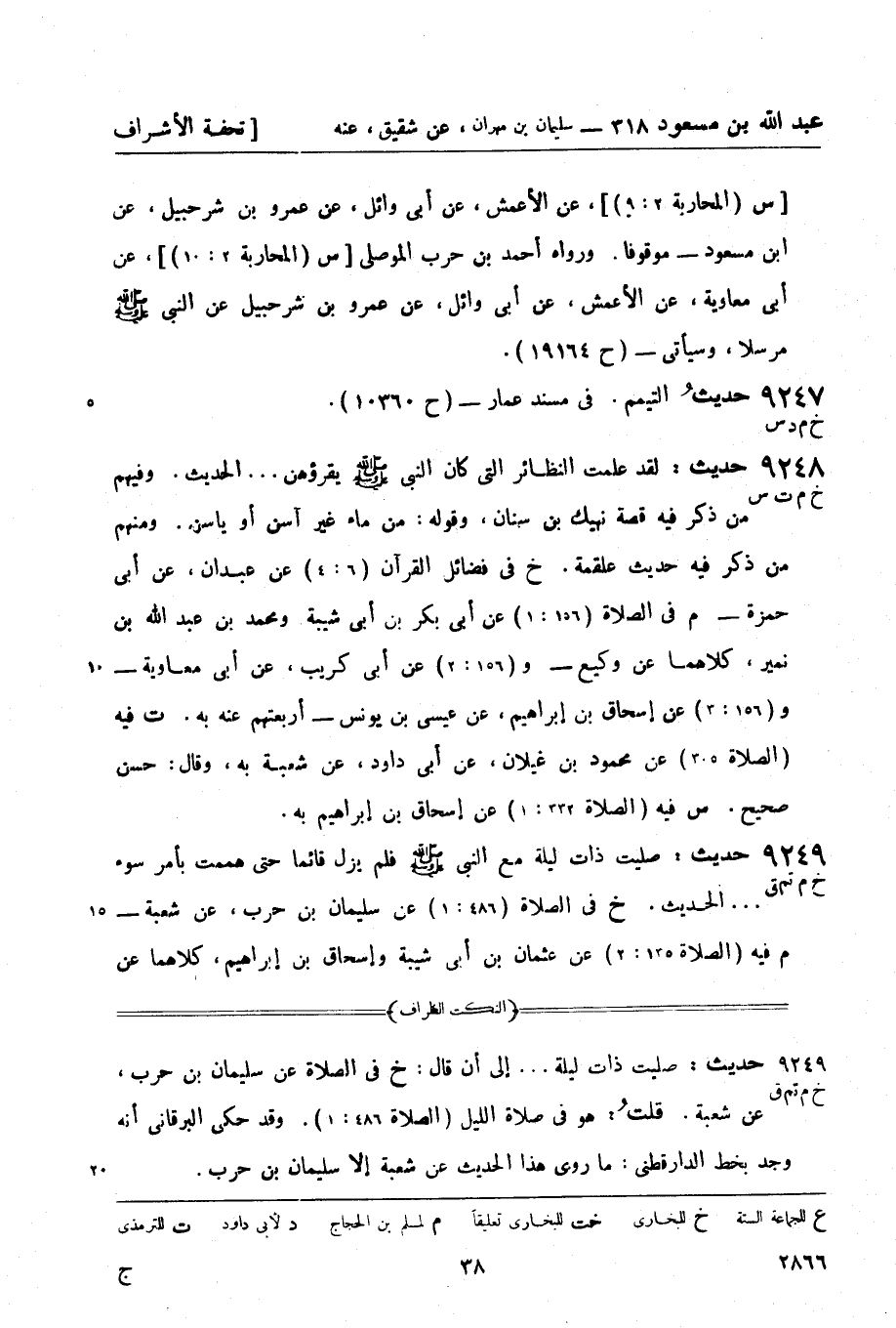 9249 - (خ م تم ق) حديث: صليت ذات ليلة مع النبيّ صَلَّى اللَّهُ عَلَيْهِ وَسَلَّمَ فلم يزل قائماً حتى هممت بأمر سوء ... الحديث. (خ) في الصلاة (486: 1) عن سليمان بن حرب , عن شعبة - (م) فيه (الصلاة 135: 2) عن عثمان بن أبي شيبة وإسحاق بن إبراهيم، كلاهما عن -[39]- جرير - و (135: 3) عن إسماعيل بن الخليل وسويد بن سعيد، كلاهما عن علي بن مسهر - ثلاثتهم عنه به. (ت) في الشمائل (41: 18) عن سفيان بن وكيع , عن جرير به. و (41: 17) عن محمود بن غيلان , عن سليمان بن حرب به. (ق) في الصلاة (239: 1) عن عبد الله بن عامر بن زرارة وسويد بن سعيد، كلاهما عن علي بن مسهر به.