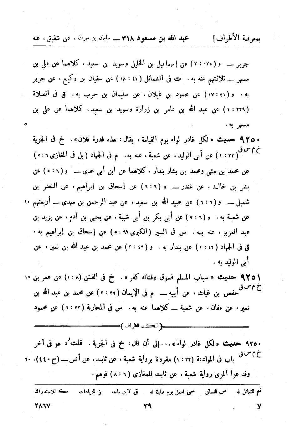 م في الجهاد (بل في المغازي 6: 5) عن محمد بن مثنى ومحمد بن بشار بندار، كلاهما عن ابن أبي عدي - و (6: 5) عن بشر بن خالد , عن غندر - و (6: 6) عن إسحاق بن إبراهيم , عن النضر بن شيمل - و (6: 6) عن عبيد الله بن سعيد , عن عبد الرحمن بن مهدي - أربعتهم عن شعبة به. و (6: 7) عن أبي بكر بن أبي شيبة , عن يحيى بن آدم , عن يزيد بن عبد العزيز، عنه به.