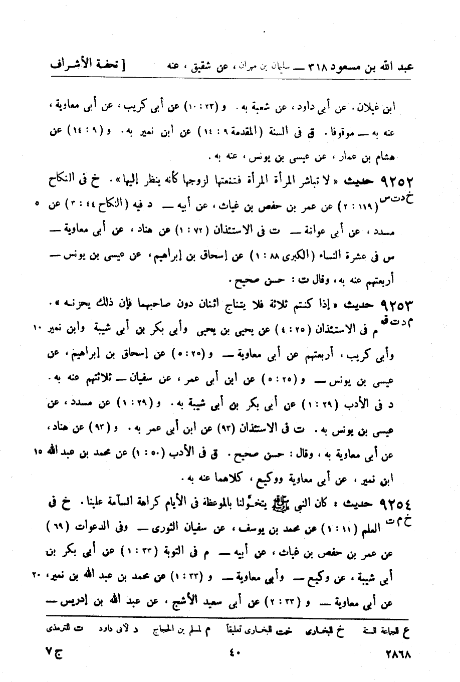 م في التوبة (33: 1) عن أبي بكر بن أبي شيبة , عن وكيع - وأبي معاوية - و (33: 1) عن محمد بن عبد الله بن نمير , عن أبي معاوية - و (33: 2) عن أبي سعيد الأشج، عن عبد الله بن إدريس -[41]- و (33: 2) عن منجاب بن الحارث , عن علي بن مسهر - و (33: 2) عن إسحاق بن إبراهيم وعلي بن خشرم، كلاهما عن عيسى بن يونس - و (33: 2) عن محمد بن يحيى بن أبي عمر , عن سفيان بن عيينة - ثمانيتهم عنه به.