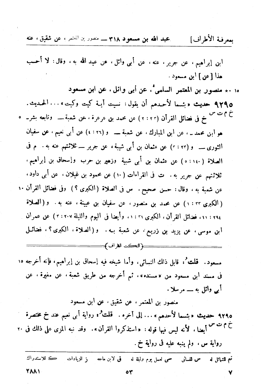 س في الصلاة (الكبرى؟) وفي فضائل القرآن (الكبرى 33: 1) عن محمد بن منصور , عن سفيان بن عيينة , عنه به. و (الصلاة 294: 11 , فضائل القرآن، الكبرى 31: 1 , وأيضاً في اليوم والليلة 307: 3) عن عمران بن موسى , عن يزيد بن زريع , عن شعبة به. و (الصلاة، الكبرى، فضائل -[54]- القرآن، الكبرى 33: 1، وأيضاً في اليوم والليلة 207: 4) عن محمود بن غيلان , عن أبي نعيم ومعاوية بن هشام، كلاهما عن سفيان الثوري - بقصة النسيان مختصرة. وفي اليوم والليلة (لا، بل في فضائل القرآن 31: 2) عن إسحاق بن إبراهيم به. و (اليوم والليلة 207: 5) عن قتيبة , عن حماد بن زيد، عنه به - موقوفاً.