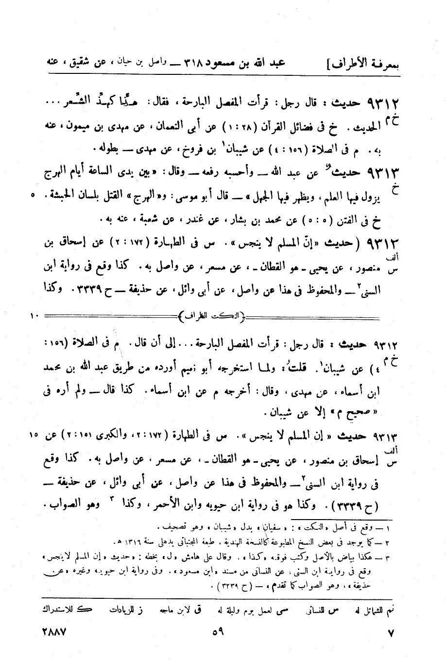 9314 - (ألف س) (حديث إنّ المسلم لا ينجس. (س) في الطهارة (172: 2) عن إسحاق بن منصور، عن يحيى - هو القطان -، عن مسعر، عن واصل به. كذا وقع في رواية ابن السني2 - والمحفوظ في هذا عن واصل، عن أبي وائل , عن حذيفة - ح 3339. وكذا -[60]- هو في رواية ابن حيويه وابن الأحمر - وهو الصواب) .