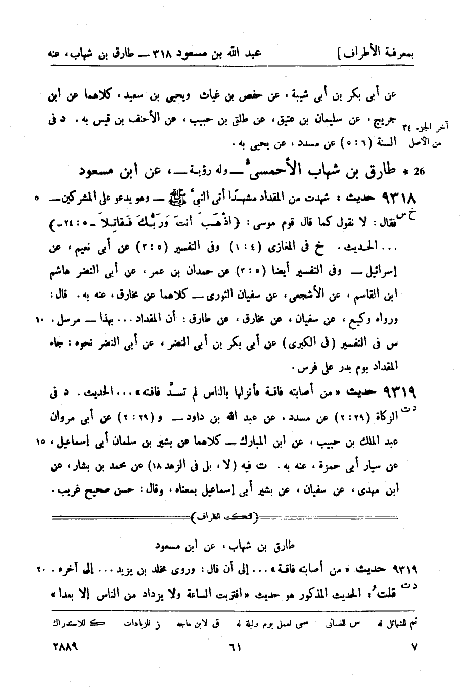ت فيه (لا، بل في الزهد 18) عن محمد بن بشار , عن ابن مهدي , عن سفيان , عن بشير أبي إسماعيل بمعناه , وقال: حسن صحيح غريب -[62]-. (ز) رواه أبو نعيم , عن بشر بن سلمان , فقال عن سيار أبي الحكم. وروى مخلد بن يزيد , عن بشير بن سلمان , عن سيار أبي الحكم , عن طارق , عن عبد الله حديثاً غير هذا [الحديث] .