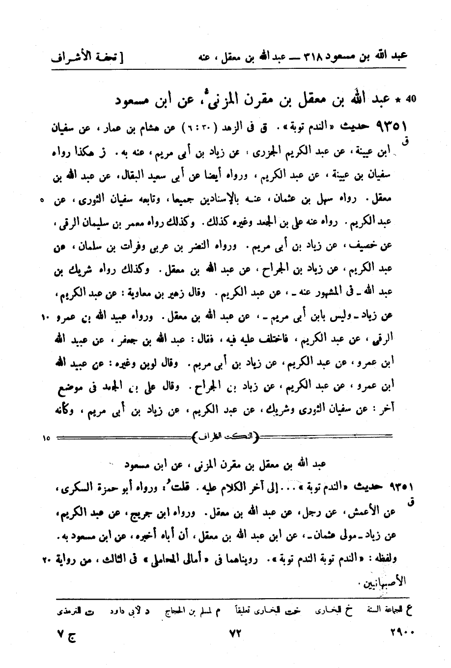 9351 -[ق] حديث الندم توبة. (ق) في الزهد (30: 6) عن هشام بن عمار , عن سفيان بن عيينة , عن عبد الكريم الجزري , عن زياد بن أبي مريم , عنه به. (ز) هكذا رواه سفيان بن عيينة , عن عبد الكريم , ورواه أيضاً عن أبي سعيد البقال , عن عبد الله بن معقل. رواه سهل بن عثمان , عنه بالإسنادين جميعاً , وتابعه سفيان الثوري , عن عبد الكريم. رواه عنه علي بن الجعد وغيره كذلك. وكذلك رواه معمر بن سليمان الرقي , عن خصيف , عن زياد بن أبي مريم. ورواه النضر بن عربي وفرات بن سلمان , عن عبد الكريم , عن زياد بن الجراح، عن عبد الله بن معقل. وكذلك رواه شريك بن عبد الله - في المشهور عنه -، عن عبد الكريم. وقال زهير بن معاوية: عن عبد الكريم , عن زياد - وليس بابن أبي مريم - , عن عبد الله بن معقل. ورواه عبيد الله بن عمرو الرقي , عن عبد الكريم , فاختلف عليه فيه , فقال: عبد الله بن جعفر , عن عبيد الله بن عمرو , عن عبد الكريم , عن زياد بن أبي مريم. وقال لوين وغيره: عن عبيد الله بن عمرو , عن عبد الكريم , عن زياد بن الجراح. وقال علي بن الجعد في موضع آخر: عن سفيان الثوري وشريك , عن عبد الكريم , عن زياد بن أبي مريم , وكأنه -[73]- حمل حديث شريك على حديث سفيان، والمحفوظ عن شريك زياد بن الجراح. وقال مغيرة بن عبد الرحمن بن عون بن حبيب بن الريان الحراني: قال لي أبي يوماً: من أين جئت؟ قلت: من عند معمر بن سليمان , فقال: ما حدثكم؟ فقلت: حدثنا عن خصيف عن زياد بن أبي مريم , عن عبد الله بن معقل , عن عبد الله بن مسعود , عن النبيّ صَلَّى اللَّهُ عَلَيْهِ وَسَلَّمَ أنه قال: الندم توبة. فقال أبي: هذا هو زياد بن الجراح، وهو عم جدتك، وكان رجلاً من أهل الحجاز من موالي عثمان. وكان زياد بن أبي مريم رجلاً من أهل الكوفة , قدم حران فنزلها وكان يتوكل لزياد بن الجراح. ثم قال: حدثني أبي عون بن حبيب , عن زياد بن الجراح , عن ابن معقل , عن ابن مسعود , عن النبيّ صَلَّى اللَّهُ عَلَيْهِ وَسَلَّمَ وذكر حديث الندم توبة. وقد روى عبد الكريم , عن زياد بن أبي مريم حديثاً غير هذا , في القول عند تدلية الميت في القبر.