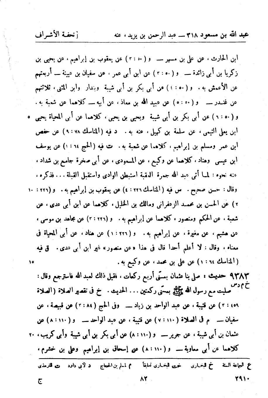9383 -[خ م د س] حديث: صلى بنا عثمان بمنًى أربع ركعات، فقيل ذلك لعبد الله فاسترجع وقال: صليت مع رسول الله صَلَّى اللَّهُ عَلَيْهِ وَسَلَّمَ بمنًى ركعتين ... الحديث.