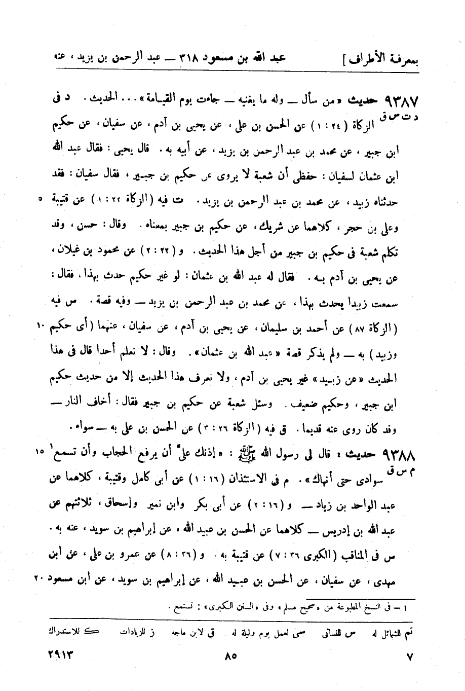 س فيه (الزكاة 87) عن أحمد بن سليمان , عن يحيى بن آدم , عن سفيان , عنهما (أي حكيم وزبيد) به - ولم يذكر قصة عبد الله بن عثمان. وقال: لا نعلم أحداً قال في هذا الحديث عن زبيد غير يحيى بن آدم , ولا نعرف هذا الحديث إلا من حديث حكيم بن جبير , وحكيم ضعيف. وسئل شعبة عن حكيم بن جبير فقال: أخاف النار - وقد كان روى عنه قديماً.