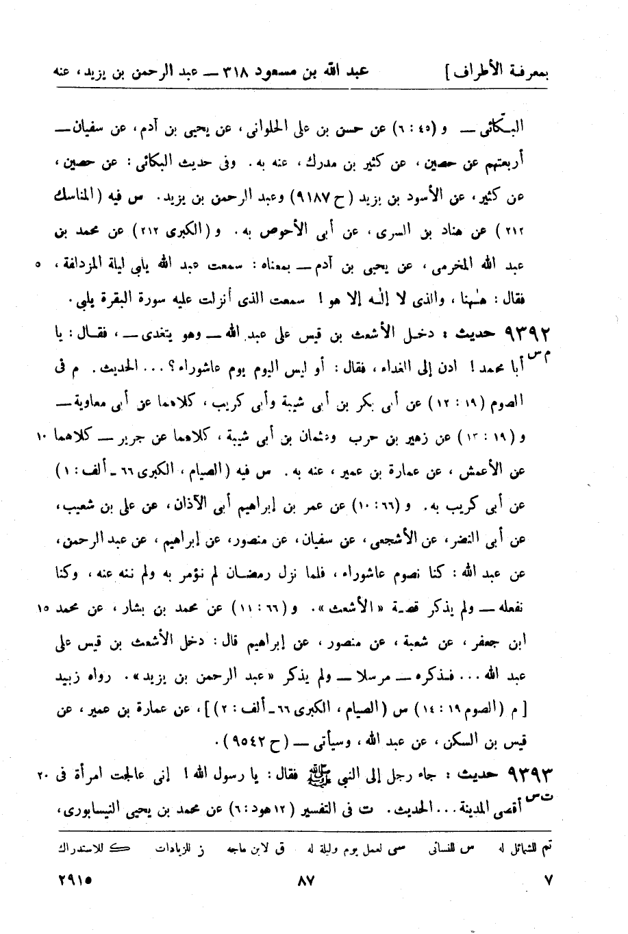 س فيه (الصيام , الكبرى 66 - ألف: 1) عن أبي كريب به. و (66: 10) عن عمر بن إبراهيم أبي الآذان , عن علي بن شعيب , عن أبي النضر , عن الأشجعي , عن سفيان , عن منصور , عن إبراهيم , عن عبد الرحمن , عن عبد الله: كنا نصوم عاشوراء , فلما نزل رمضان لم نؤمر به ولم ننه عنه , وكنا نفعله - ولم يذكر قصة الأشعث. و (66: 11) عن محمد بن بشار , عن محمد بن جعفر , عن شعبة , عن منصور , عن إبراهيم قال: دخل الأشعث بن قيس على عبد الله ... فذكره - مرسلاً - ولم يذكر عبد الرحمن بن يزيد. رواه زبيد [م (الصوم 19: 14)