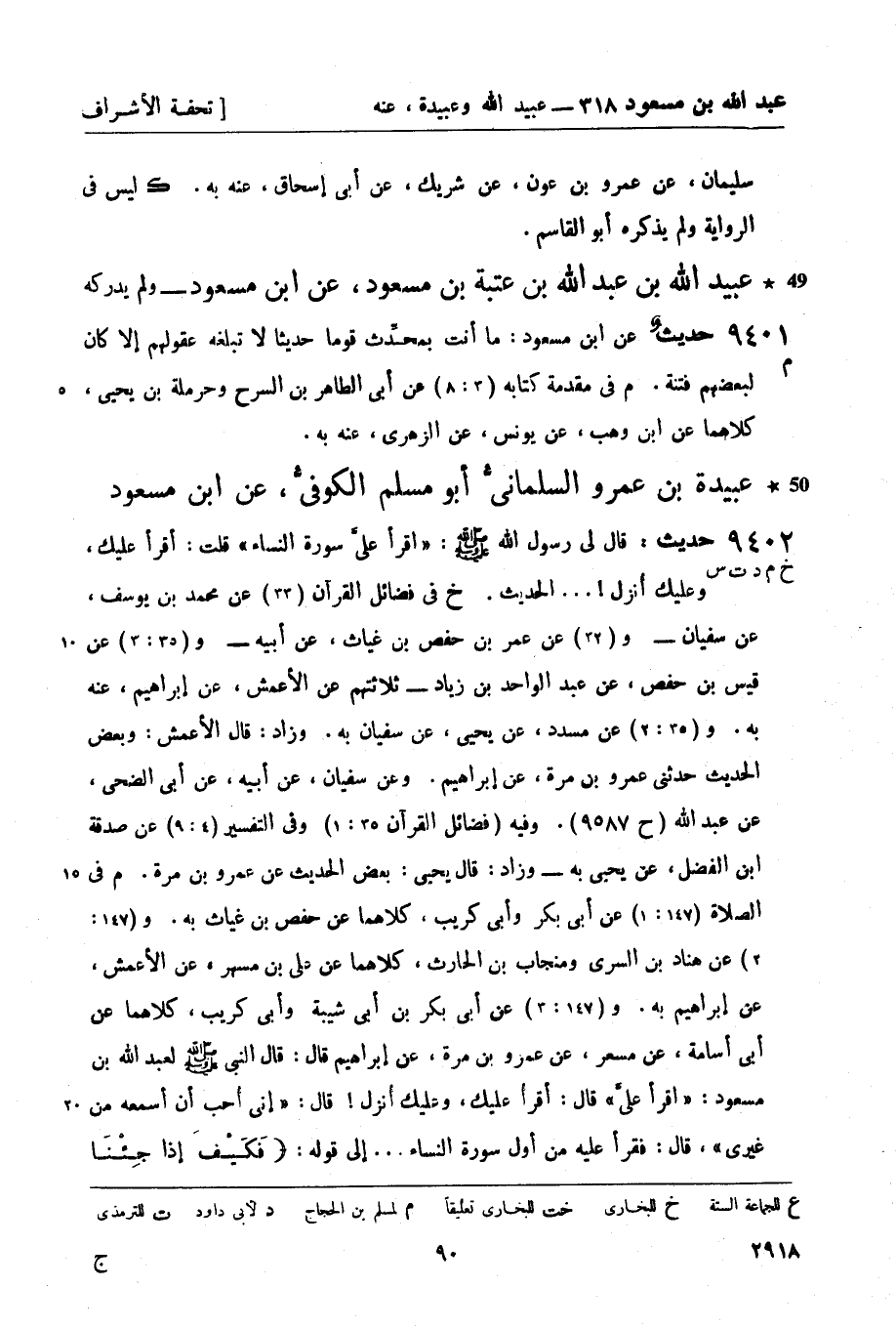 9402 -[خ م د ت س] حديث: قال لي رسول الله صَلَّى اللَّهُ عَلَيْهِ وَسَلَّمَ: أقرأ عليَّ سورة النساء قلت: أقرأ عليك , وعليك أُنزل! ... الحديث.
