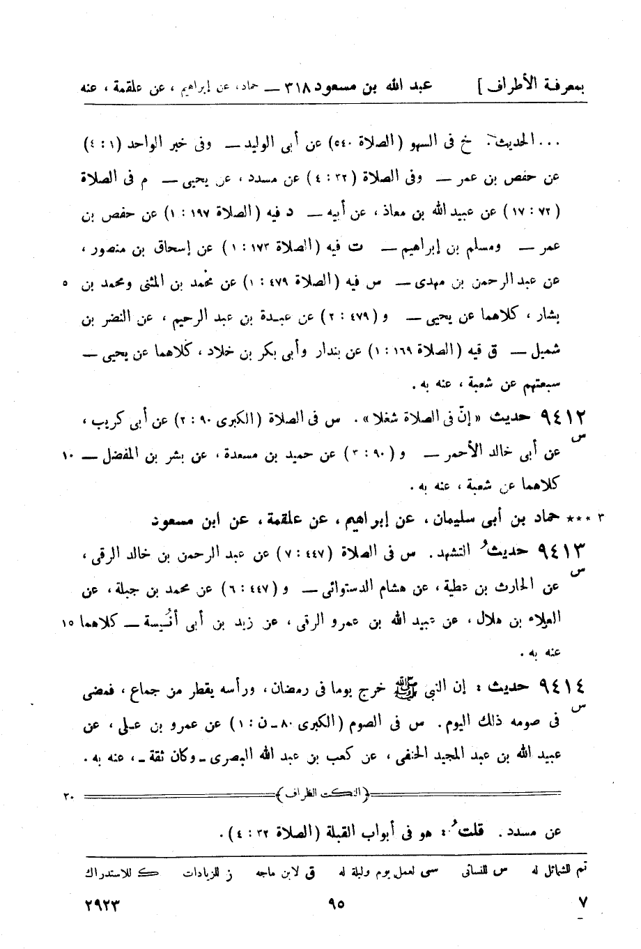 9412 -[س] حديث إنّ في الصلاة شغلاً. (س) في الصلاة (الكبرى 90: 2) عن أبي كريب , عن أبي خالد الأحمر - و (90: 3) عن حميد بن مسعدة , عن بشر بن المفضل - كلاهما عن شعبة , عنه به.