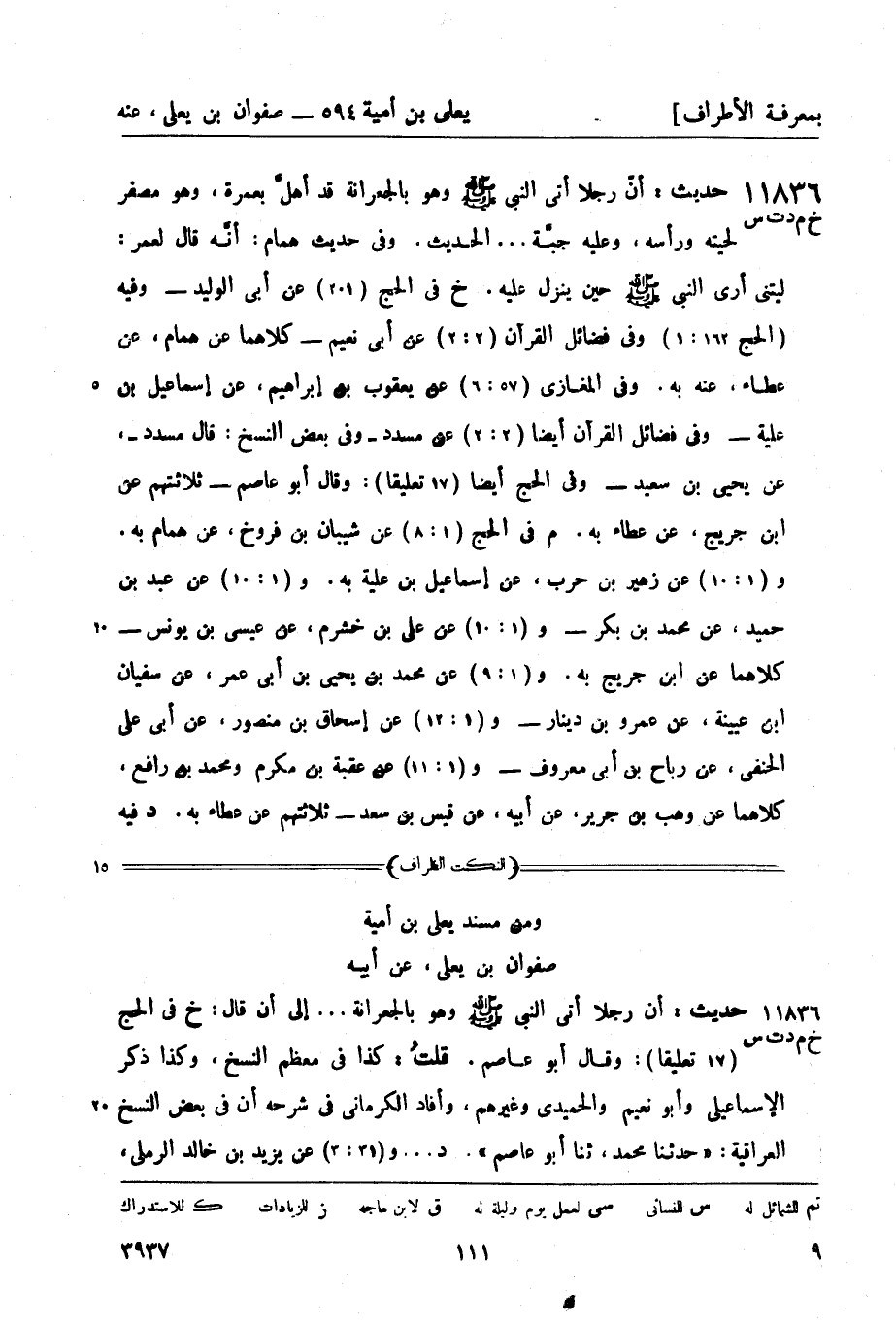 س فيه (المناسك 29) وفي فضائل القرآن (الكبرى 1: 6) عن نوح بن حبيب، عن يحيى بن سعيد به. و (المناسك 29) زاد: قال: ثم أحدث إحراماً. قال: ولا أعلم أحداً قال: ثم أحدث إحراماً غير نوح بن حبيب، ولا أحسبه محفوظاً. و (المناسك 44: 1، وفضائل القرآن، الكبرى؟) عن محمد بن منصور - و (المناسك، الكبرى؟، وفضائل القرآن الكبرى 1: 7) عبد الجبار بن العلاء - فرقهما - كلاهما عن سفيان بن عيينة نحوه. و (44: 2) عن محمد بن إسماعيل بن إبراهيم، عن وهب بن جرير به. و (المناسك. الكبرى 292: 1، وفضائل القرآن، الكبرى؟) عن عيسى بن حماد، عن ليث، عن عطاء، عن ابن منية، عن أبيه به. روي عن عطاء، عن يعلى بن أمية، وسيأتي - (ح 11844) . ورواه عباس بن الوليد النرسي، عن داود العطار، عن ابن جريج، عن عطاء، عن يعلى بن أمية -[113]- أو صفوان بن يعلى بن أمية: أن رجلاً أتى النبي صَلَّى اللَّهُ عَلَيْهِ وَسَلَّمَ - ولم يقل: عن أبيه.