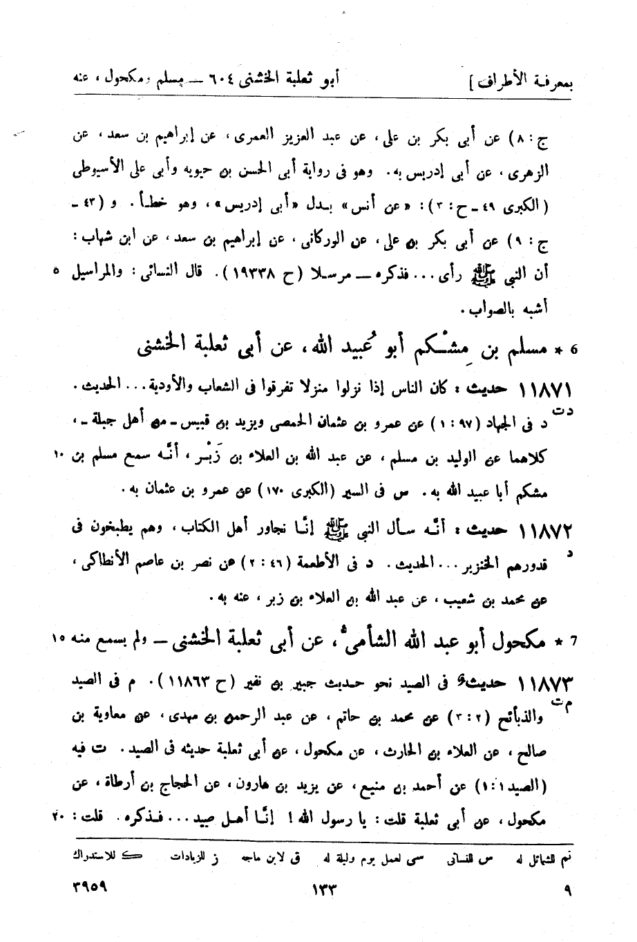 ت فيه (الصيد 1: 1) عن أحمد بن منيع، عن يزيد بن هارون، عن الحجاج بن أرطاة، عن مكحول، عن أبي ثعلبة قلت: يا رسول الله! إنَّا أهل صيد ... فذكره. قلت: -[134]- إنَّا أهل رمى ... فذكره. قلت: إنَّا أهل سفر، فنمرُّ على اليهود والنصارى ... الحديث. و (1: 1) عن الحجاج، عن الوليد بن أبي مالك، عن عائذ الله أنَّه سمع أبا ثعلبة به، وقال: حسن.