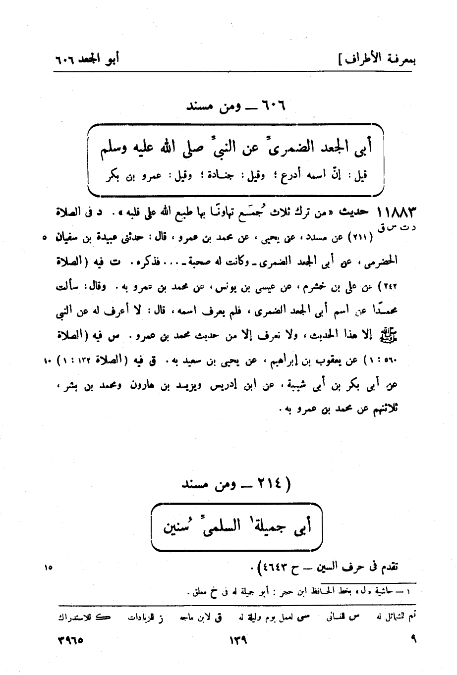 ت فيه (الصلاة 242) عن علي بن خشرم، عن عيسى بن يونس، عن محمد بن عمرو به. وقال: سألت محمداً عن اسم أبي الجعد الضمري، فلم يعرف اسمه، قال: لا أعرف له عن النبي صَلَّى اللَّهُ عَلَيْهِ وَسَلَّمَ إلا هذا الحديث، ولا تعرف إلا من حديث محمد بن عمرو.