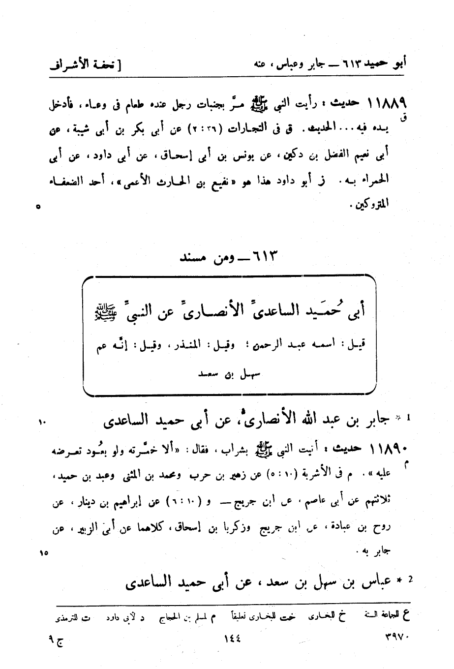 ومن مسند أبي حُمَيد الساعديِّ الأنصاريِّ عن النبي صَلَّى اللَّهُ عَلَيْهِ وَسَلَّمَ قيل: اسمه عبد الرحمن؛ وقيل: المنذر، وقيل: إنَّه عم سهل بن سعد