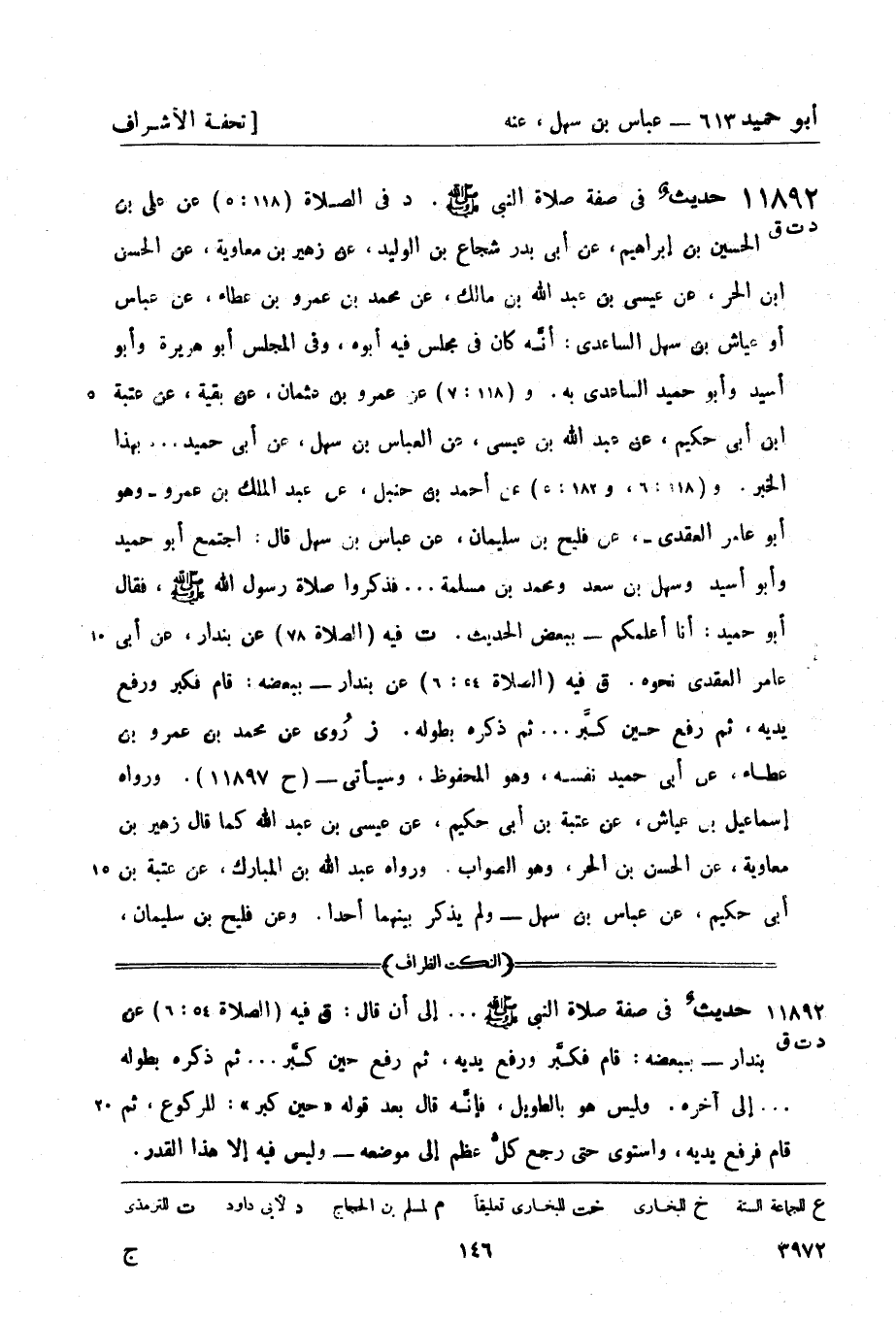 11892 -[د ت ق] حديثٌ في صفة صلاة النبيّ صَلَّى اللَّهُ عَلَيْهِ وَسَلَّمَ (د) في الصلاة (118: 5) عن علي بن الحسين بن إبراهيم، عن أبي بدر شجاع بن الوليد، عن زهير بن معاوية، عن الحسن بن الحر، عن عيسى بن عبد الله بن مالك، عن محمد بن عمرو بن عطاء، عن عباس أو عياش بن سهل الساعدي: أنَّه كان في مجلس فيه أبوه، وفي المجلس أبو هريرة وأبو أسيد وأبو حميد الساعدي به و (118: 7) عن عمرو بن عثمان، عن بقية، عن عتبة بن أبي حكيم، عن عبد الله بن عيسى، عن العباس بن سهل، عن أبي حميد ... بهذا الخبر و (118: 6، و182: 5) عن أحمد بن حنبل، عن عبد الملك بن عمرو - وهو أبو عامر العقدي، عن فليح بن سليمان، عن عباس بن سهل قال: اجتمع أبو حميد وأبو أسيد وسهل بن سعد ومحمد بن مسلمة ... فذكروا صلاة رسول الله صَلَّى اللَّهُ عَلَيْهِ وَسَلَّمَ، فقال أبو حميد: أنا أَعلمكم - ببعض الحديث.