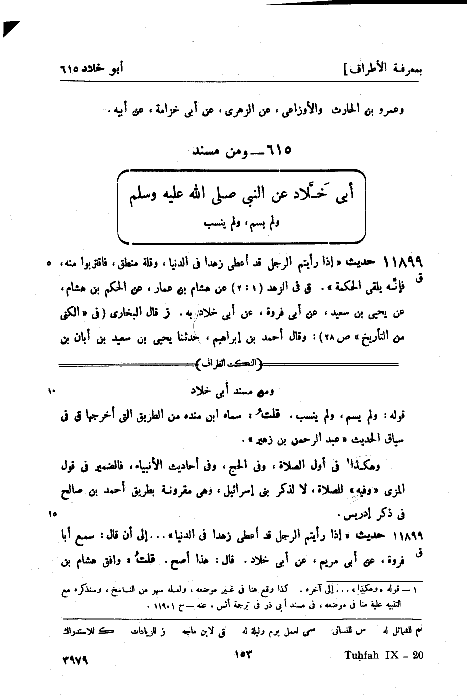 11899 -[ق] حديث إذا رأيتم الرجل قد أعطى زهداً في الدنيا، وقلة منطق، فاقتربوا منه، فإنَّه يلقى الحكمة (ق) في الزهد (1: 2) عن هشام بن عمار، عن الحكم بن هشام، عن يحيى بن سعيد، عن أبي فروة، عن أبي خلاد به. (ز) قال البخاري (في الكنى من التاريخ ص 28) : وقال أحمد بن إبراهيم، حدثنا يحيى بن سعيد بن أبان بن -[154]- سعيد بن العاص أخو عنبسة: سمع أبا فروة الجزري، عن أبي مريم، عن أبي خلاد عن النبيّ صَلَّى اللَّهُ عَلَيْهِ وَسَلَّمَ. قال: وهذا أصح.