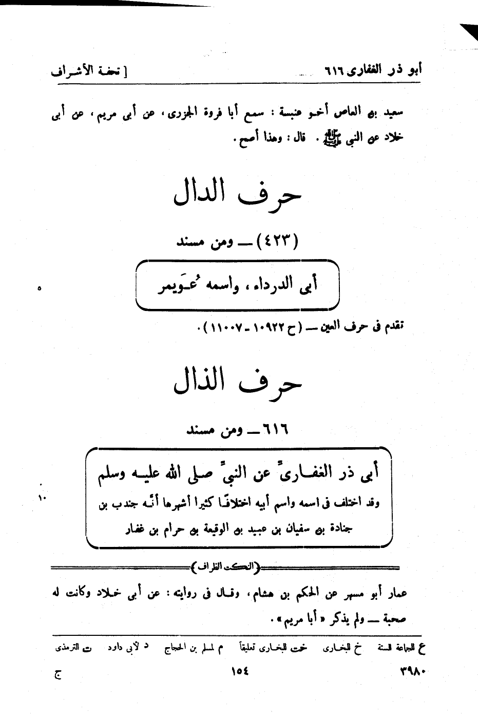 ومن مسند أبي ذر الغفاريِّ عن النبي صَلَّى اللَّهُ عَلَيْهِ وَسَلَّمَ وقد اختلف في اسمه واسم أبيه اختلافاً كثيراً أشهرها أنَّه جندب بن جنادة بن سفيان بن عبيد بن الوقيعة بن حرام بن غفار