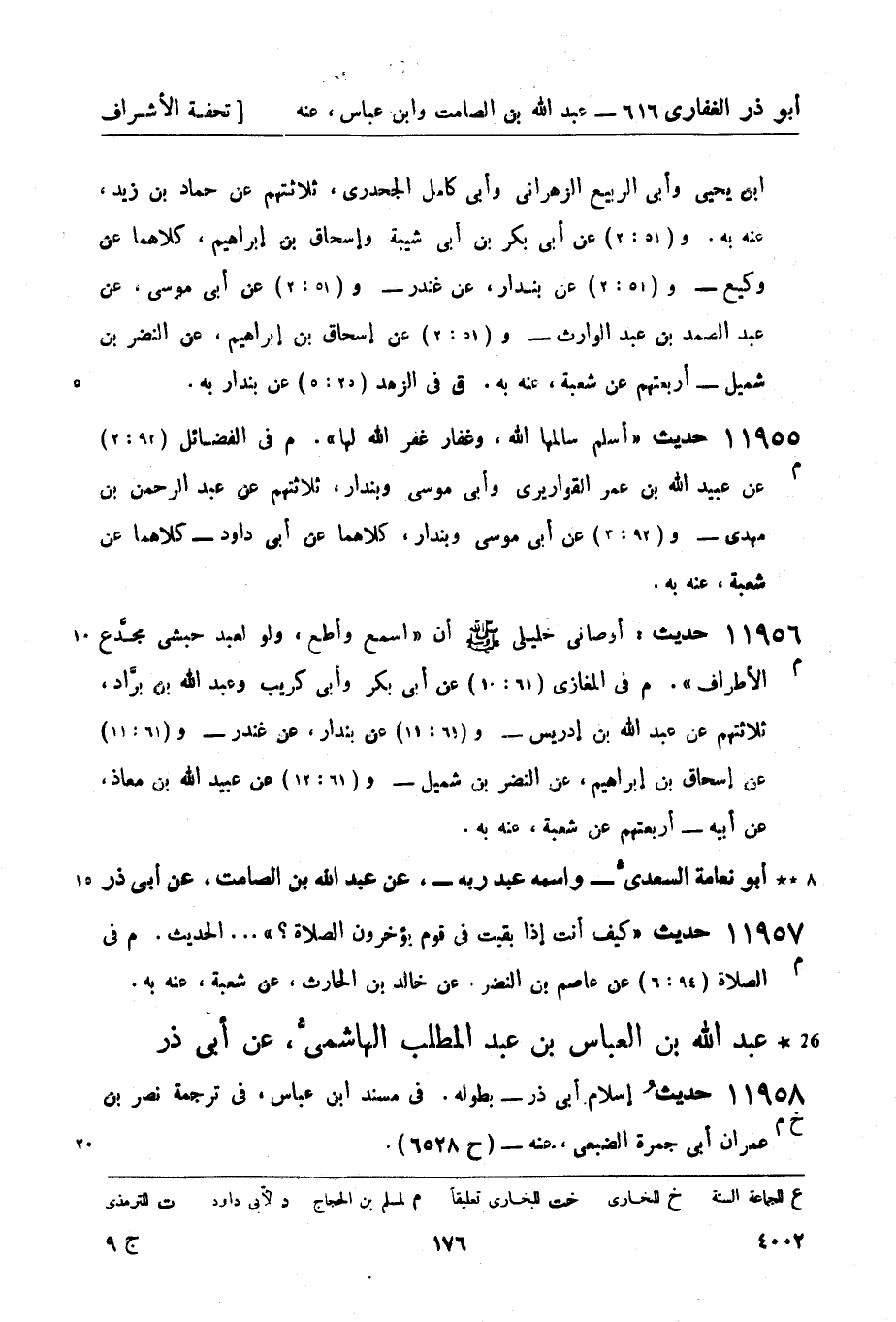 11958 - حديثُ إسلام أبي ذر - بطوله. في مسند ابن عباس، في ترجمة نصر بن عمران أبي جمرة الضبعي، عنه - (ح 6528) .