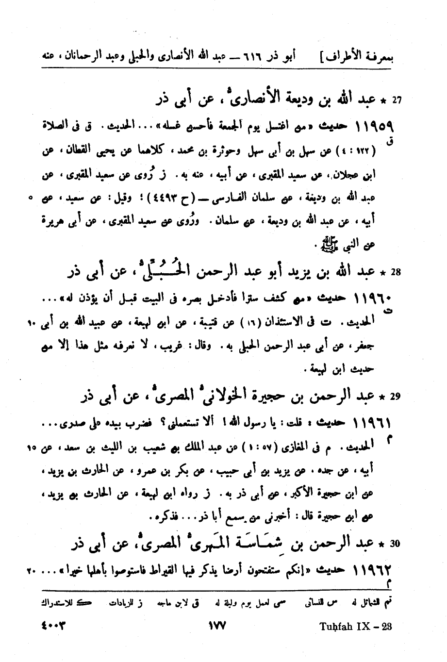 م في المغازي (57: 1) عن عبد الملك بن شعيب بن الليث بن سعد، عن أبيه، عن جده، عن يزيد بن أبي حبيب، عن بكر بن عمرو، عن الحارث بن يزيد، عن ابن حجيرة الأكبر، عن أبي ذر به. (ز) رواه ابن لهيعة، عن الحارث بن يزيد، عن ابن حجيرة قال: أخبرني من سمع أبا ذر ... فذكره.