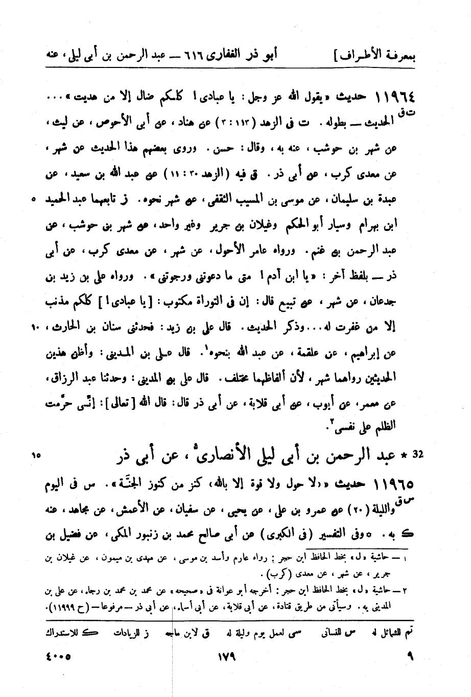 ق فيه (الزهد 30: 11) عن عبد الله بن سعيد، عن عبدة بن سليمان، عن موسى بن المسيب الثقفي، عن شهر نحوه. (ز) تابعهما عبد الحميد بن بهرام وسيار أبو الحكم وغيلان بن جرير وغير واحد، عن شهر بن حوشب، عن عبد الرحمن بن غنم. ورواه عامر الأحول، عن شهر، عن معدي كرب، عن أبي ذر بلفظ آخر: يا ابن آدم! متى ما دعوتني ورجوتني. ورواه علي بن زيد بن جدعان، عن شهر، عن تبيع قال: إن في التوراة مكتوب: [يا عبادي!] كلكم مذنب إلا من غفرت له ... وذكر الحديث. قال علي بن زيد: فحدثني سنان بن الحارث عن إبراهيم، عن علقمة، عن عبد الله بنحوه1. قال علي بن المديني: وأظن هذين الحديثين رواهما شهر، لأن ألفاظهما مختلف. قال علي بن المديني: وحدثنا عبد الرزاق، عن معمر، عن أيوب، عن أبي قلابة، عن أبي ذر قال: قال الله [تعالى] : إنِّي حرَّمت الظلم على نفسي2.