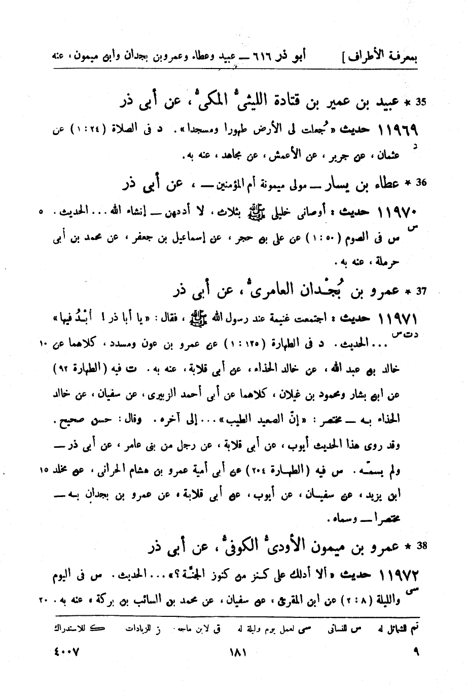 ت فيه (الطهارة 92) عن ابن بشار ومحمود بن غيلان، كلاهما عن أبي أحمد الزبيري، عن سفيان، عن خالد الحذاء به - مختصر: إن الصعيد الطيب ... إلى آخره. وقال: حسن صحيح. وقد روى هذا الحديث أيوب، عن أبي قلابة، عن رجل من بني عامر، عن أبي ذر - ولم يسمّه.