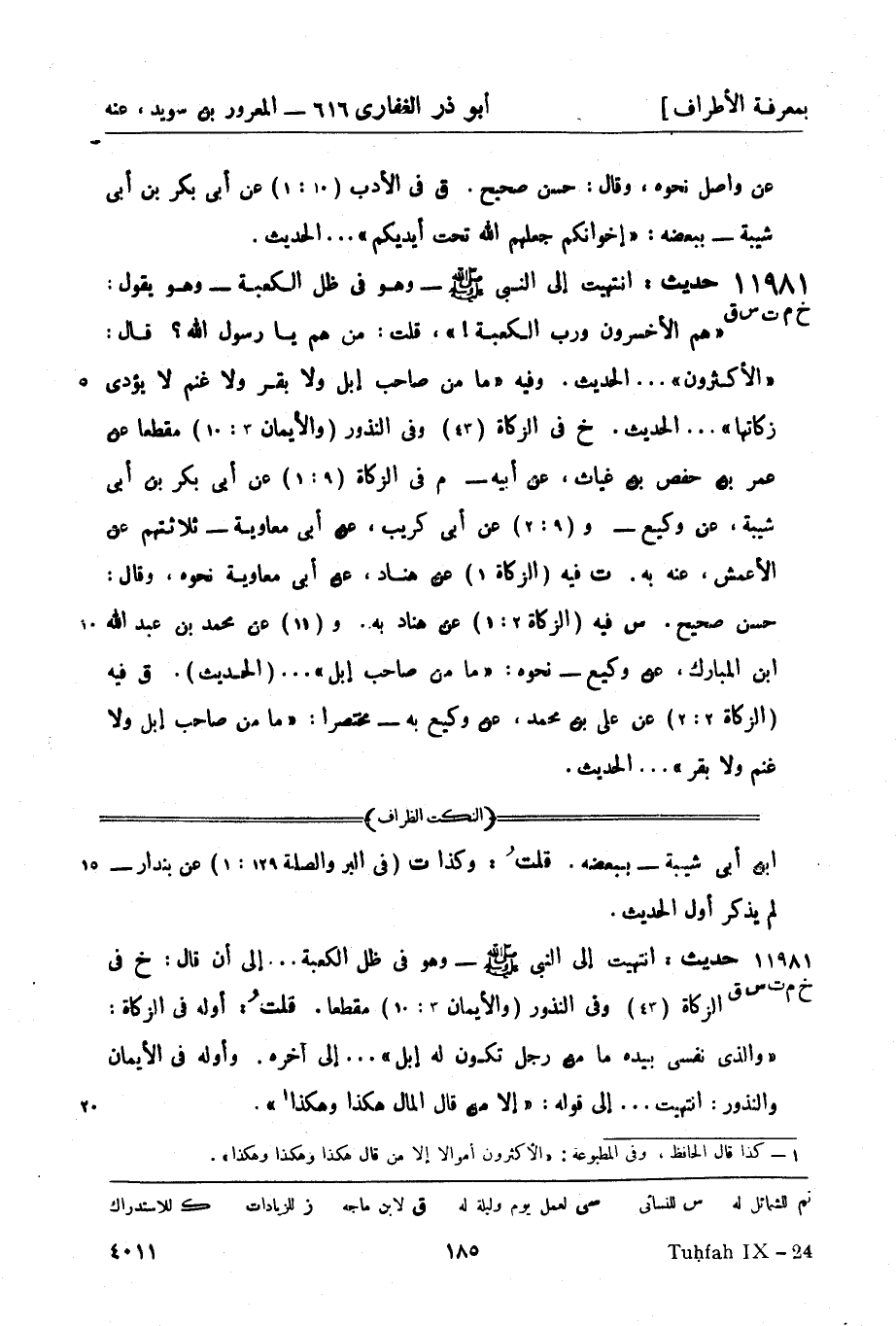 س فيه (الزكاة 2: 1) عن هناد به. و (11) عن محمد بن عبد الله بن المبارك، عن وكيع - نحوه: ما من صاحب إبل ... (الحديث) .
