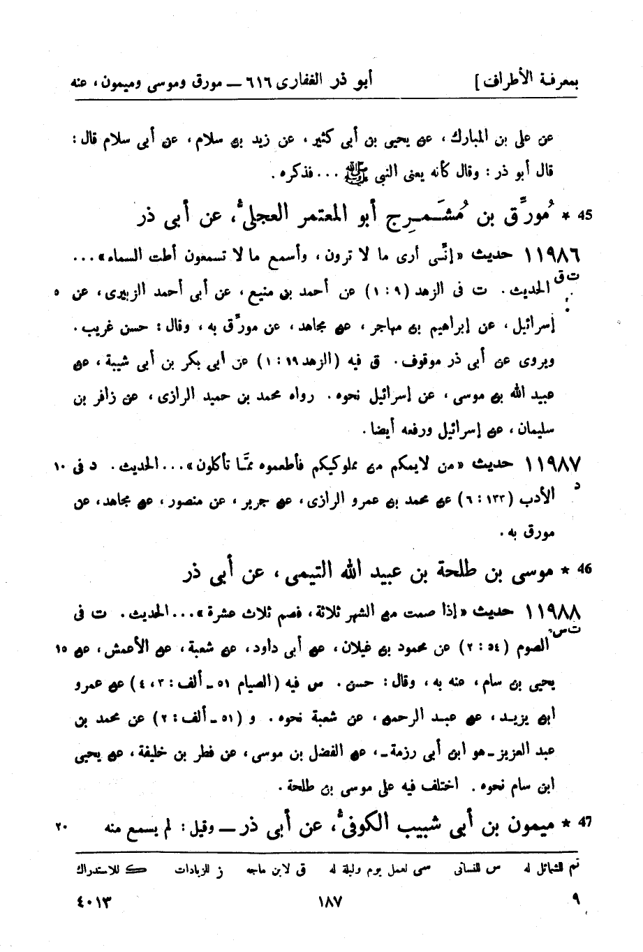ت في الزهد (9: 1) عن أحمد بن منيع، عن أبي أحمد الزبيري، عن إسرائيل، عن إبراهيم بن مهاجر، عن مجاهد، عن مورِّق به، وقال: حسن غريب. ويروى عن أبي ذر موقوف.